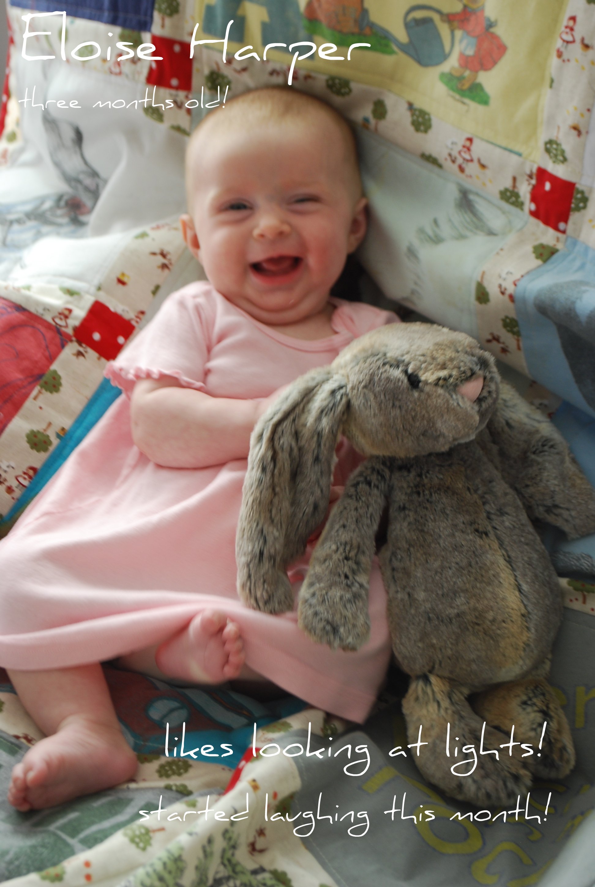 It has been a very busy couple of weeks. I’m sorry I have been absent from this space and I’m sorry this monthly picture is going up so late. I did take the picture on the actual day Ellie turned three months but after moving to a new house, dropping my phone in the dog’s water bowl and leaving my laptop power cord back in our old place, I think I have some pretty good excuses for not blogging lately. We are somewhat settled now and I did get my power cord back, so I’m prepared to be in this space more often.
