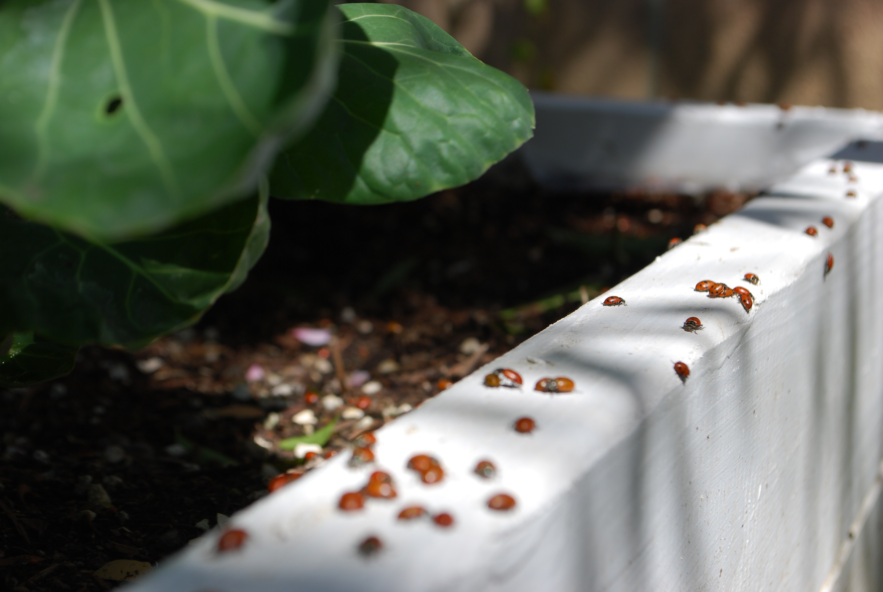 We have a serious aphid problem in the garden. My brussel sprouts which were growing beautifully are all of a sudden covered in aphids. I was debating cutting them all down but thought I should try bringing in the troops first. We’ve had some luck before with ladybugs and our balcony garden in Orange County. This seems like a bigger job but I thought I’d give it a try before doing anything rash like chopping everything down. Ellie and I went to the garden store and picked up a bag o’ ladybug as well as some praying mantis eggs (hoping they hatch  and start munching away on the bad bugs soon). I released the lady bugs that morning and it was certainly a sight to see. I love watching them do their thing. I’m sure our neighbors think I’m quite strange rooting on the ladybugs as they find and devour those nasty green aphids that are destroying my garden. We shall see in a few days if the lady bugs were bug enough to take on such a feat as my garden… for now, I leave you with lady bug pictures!