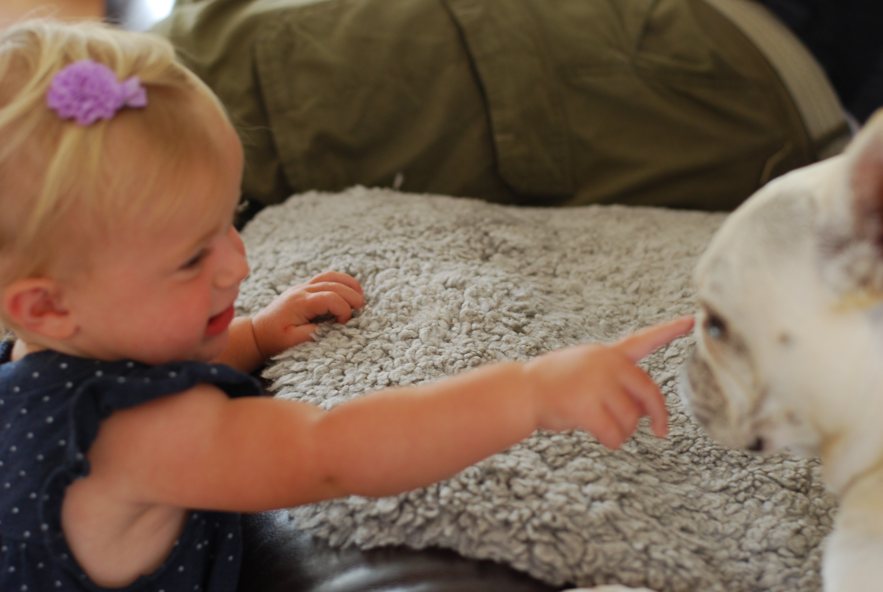 It was a quick, sunny, nice weekend. Jeff and his sister went to the Red Sox/Dodgers game so we spent the day with Gramma and Grandpa. They of course spoil their little grand baby rotten (i.e. new push car toy)! We had such a nice day with them! We discovered “noses” this past week and finding everyone’s (including the dogs’). I got Ellie’s hair pulled back in two pig tails for the first time and oh my, she is darling with pig tails! I think she thinks so too. Sunday was a lazy day with walks downtown, cookies and iced chai’s in the afternoon and a tired-but-happy-she-got-to-go-with-us bulldog. The house is in ruins and laundry is piling up. I have a long week ahead of me. But thank goodness for lazy weekends. How was your weekend?