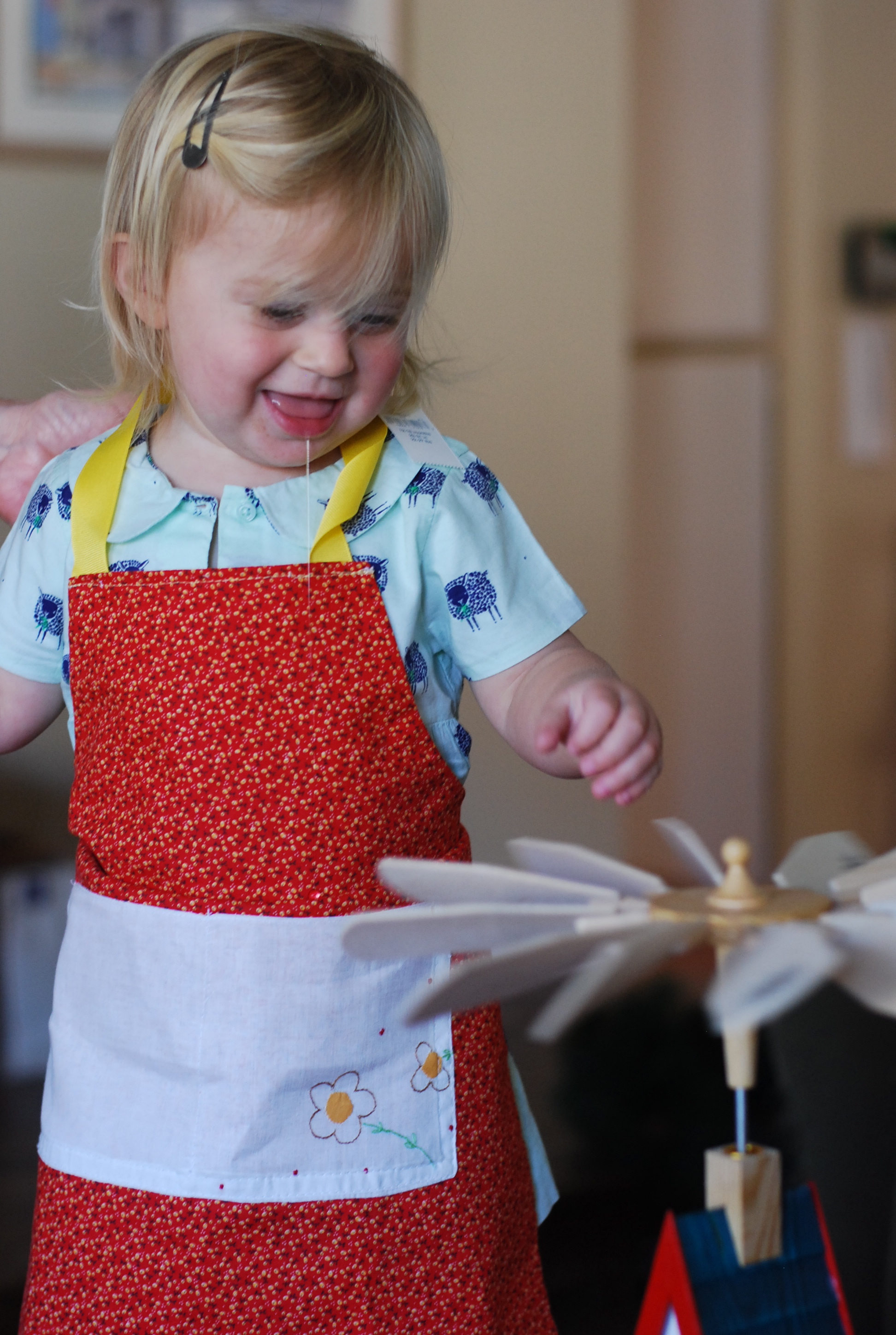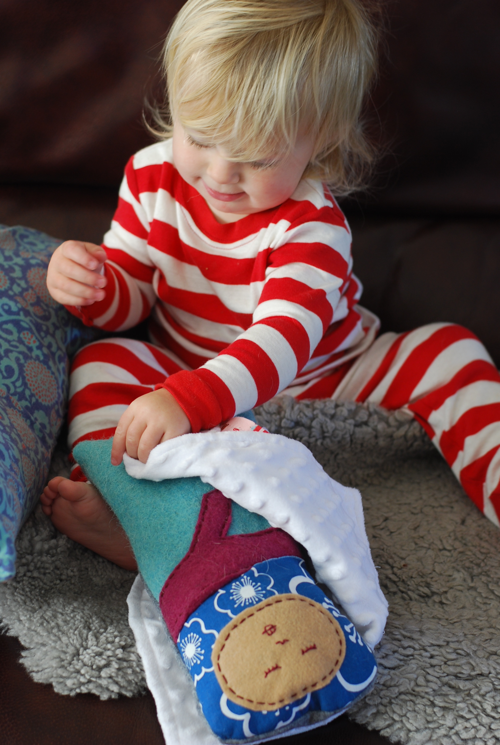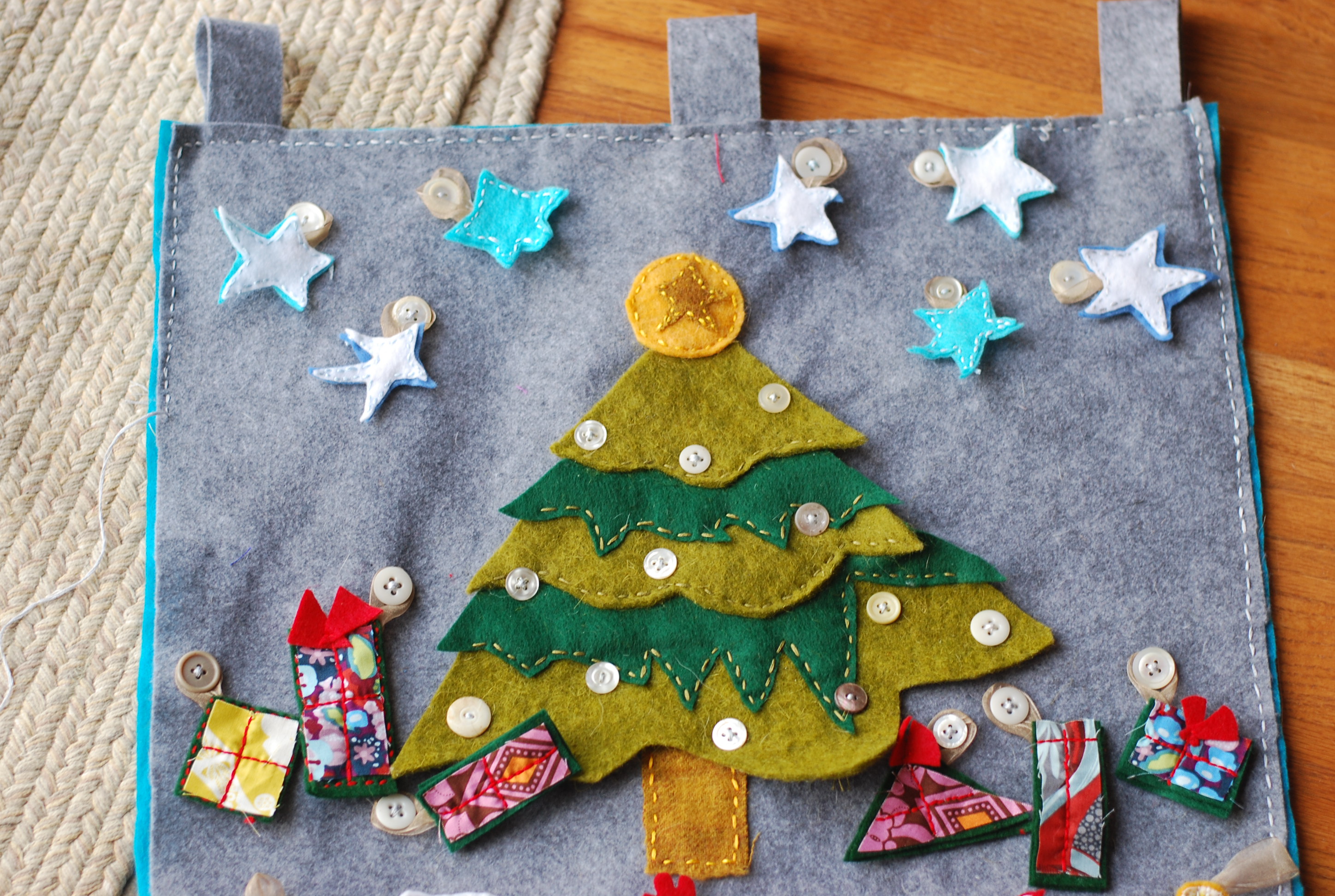 Since visiting the library this holiday season and bringing home The 12 days of Christmas, (Ellie likes this version best) Ellie has been obsessed with the song and the book. It was a Christmas song I never really cared for because of obvious reasons. But, after my darling daughter showed such joy over the lyrics. It has quickly become and will probably always be a favorite now in this household (a love and hate favorite Jeff says). I thought it would be fun to create the 12 days as advent caricatures. So what you see in the pockets and eventually on the tree are 12 drummers drumming, 11 pipers piping, 10 lords a leapin’, 9 ladies dancing, 8 maids a milkin’, 7 swans a swimming, 6 geese a layin’, 5 gold rings, 4 calling birds, 3 french hens, 2 turtle doves, and a partridge in a pear tree. The other 13 advent pocket buddies are stars and presents to finish out the vision on top. I got very close to the ways of sewing with felt with this project and I think I may be smitten. I’m sure you will see much more felt (especially the wool kind) in my crafting future.
