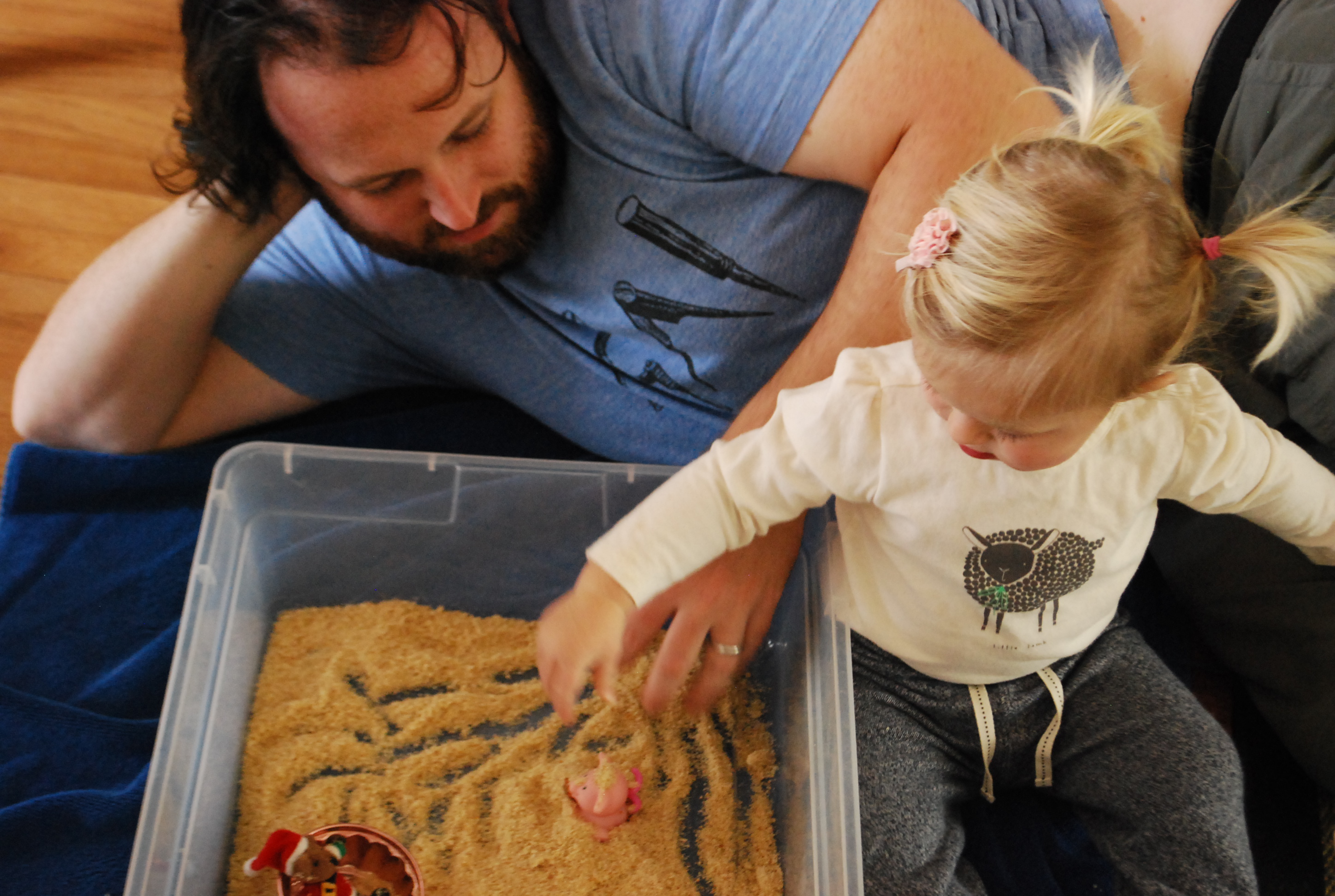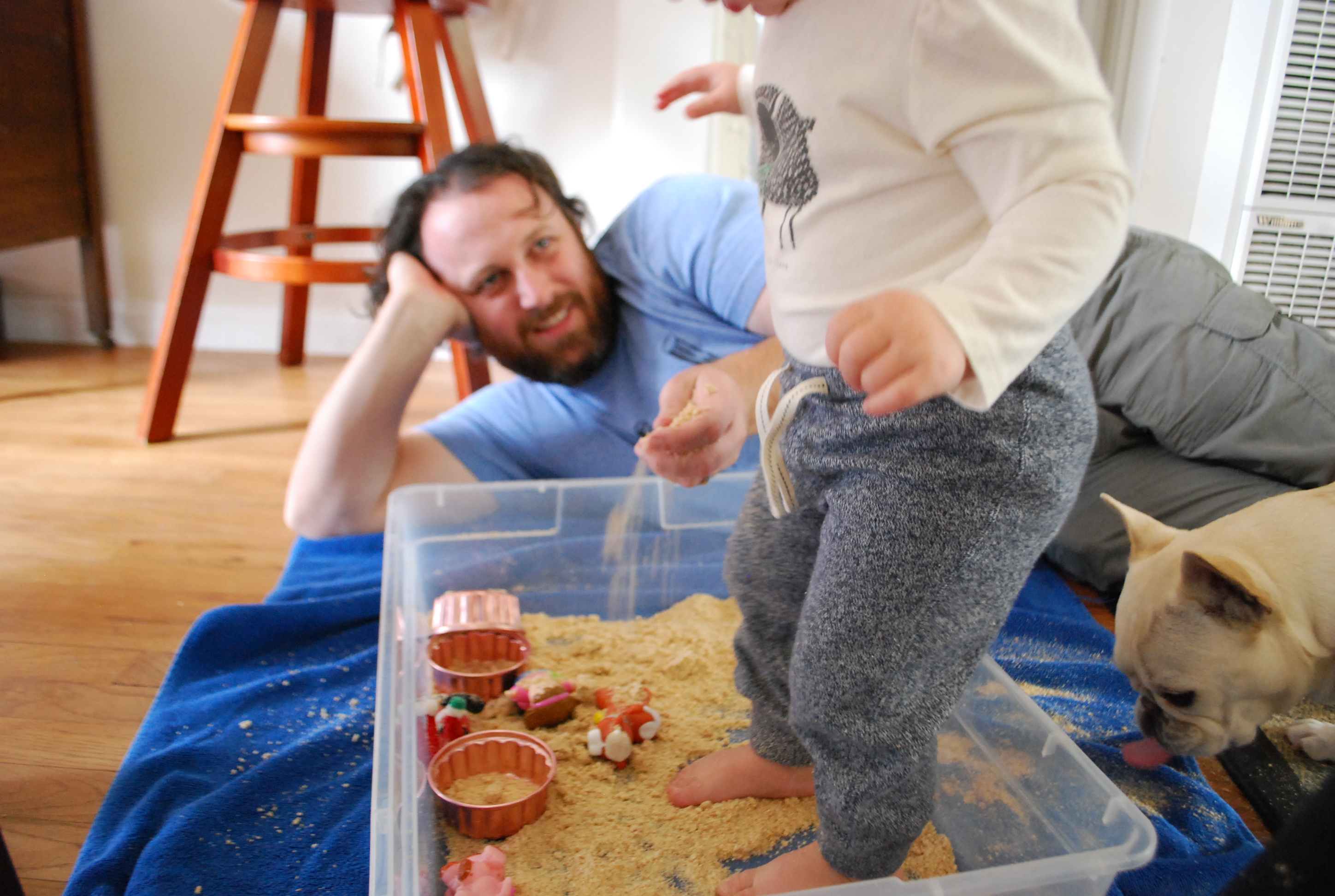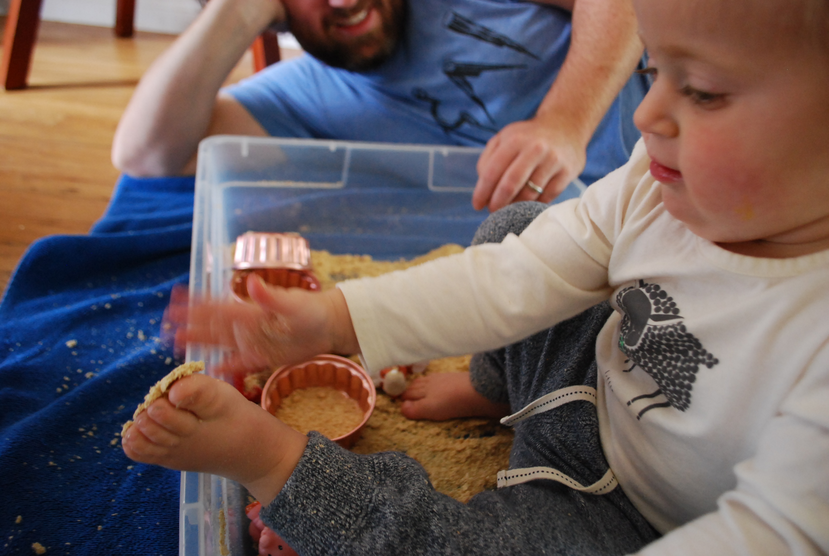 Ellie has been really interested in sensory experiences lately. Every meal gets wiped across the high chair, washing hands becomes a quick splash in the fountain and taking a walk always includes finding patches of dirt to dig in. So I’ve been eager to find new and exciting sensory experiences for her. The other day I stumbled upon this wonderfully inspiring and helpful blog and found her recipe for Edible Pretend Snow. I had never heard of using bread in a sensory bin before but was intrigued by what she said would happen to its texture when put through the food processor. We happened to have half a loaf of partly stale bread we were going to save for the birds or croutons if Jeff got around to it, so I went to work throwing the loaf into the food processor for a new sensory experience for Ellie. Because it was wheat bread, the color was much less “snow-like” and more “sand-like”. But, that certainly didn’t stop Ellie (and her Daddy) from enjoying a fun morning of exploring what I like to call the “Sandy Snow Sensory Bin”.