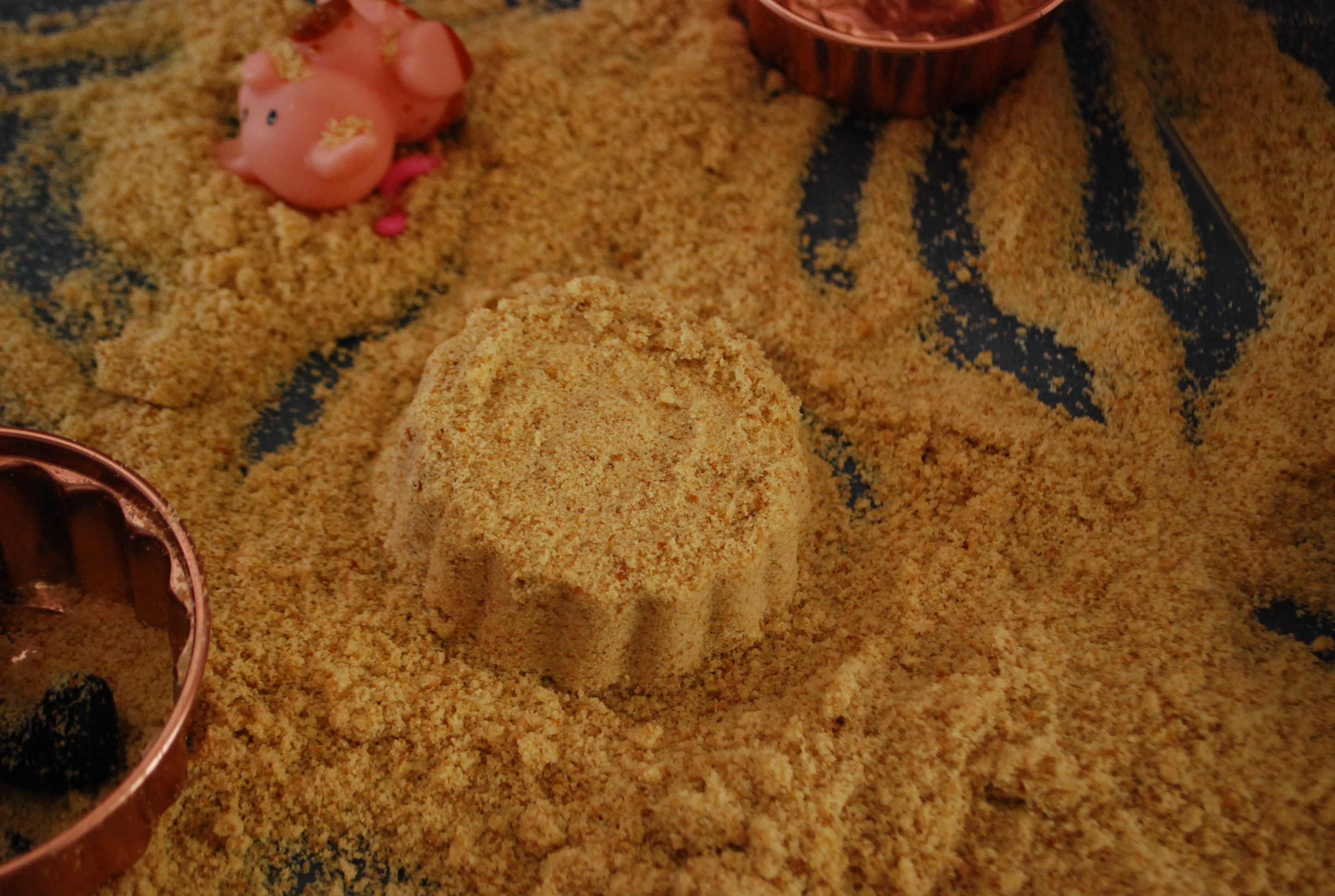 It was a neat sensory tub and I’m glad we got to try it. I definitely wouldn’t do this very often, seeing that you use up almost a whole loaf of bread (when we were done with ours, we added the bread crumbs to the bird feeder outside and watched the little sparrows flock). It also doesn’t keep well. By the end of the day, our bin was smelling like yeasty mush (thus it became bird food). But, it the Sandy snow was a different texture for Ellie to explore and a fun part of our day.
