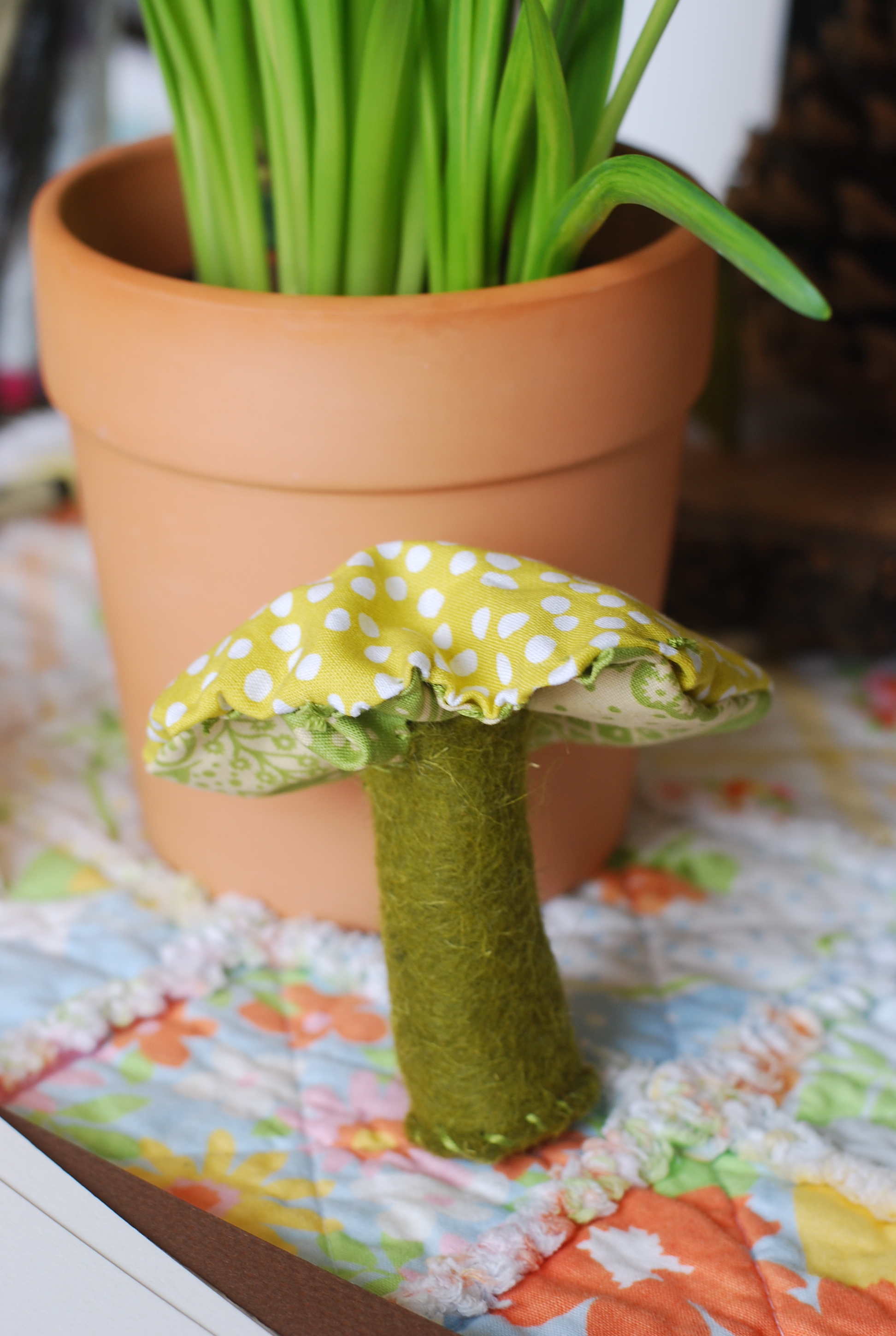 Handmade mushroom’s on top of newly dusted off spring time runner (I love taking this runner out of its box)!