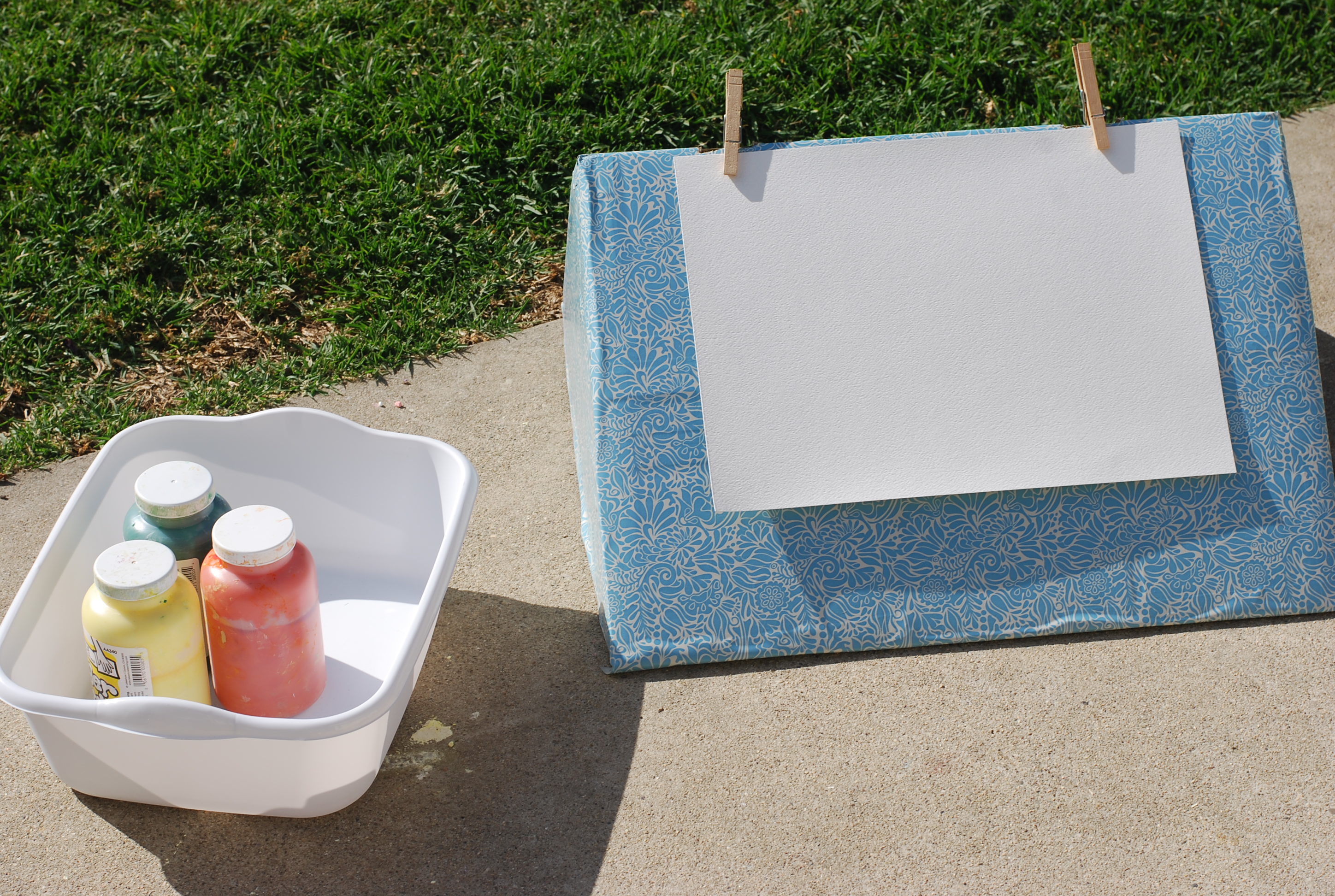 When I was a young child living in Hawaii (my Dad was in the air force during my early years) , my mom would take me to a local park for “play mornings”. I don’t remember much about it, but I think it was like Gymboree or Mommy and Me before there was such a thing. Anyway, at play mornings we got to do all sorts of fun things like painting and playdoh. My mom took those ideas home with her and I remember many childhood days of arts and crafts at home, my mom cooking playdoh on the stove for us or creating tabletop easels. The other day, I asked her how she made those easels so I could make one for Ellie. A couple of days later she showed up with this box, all ready for some contact paper to complete it.