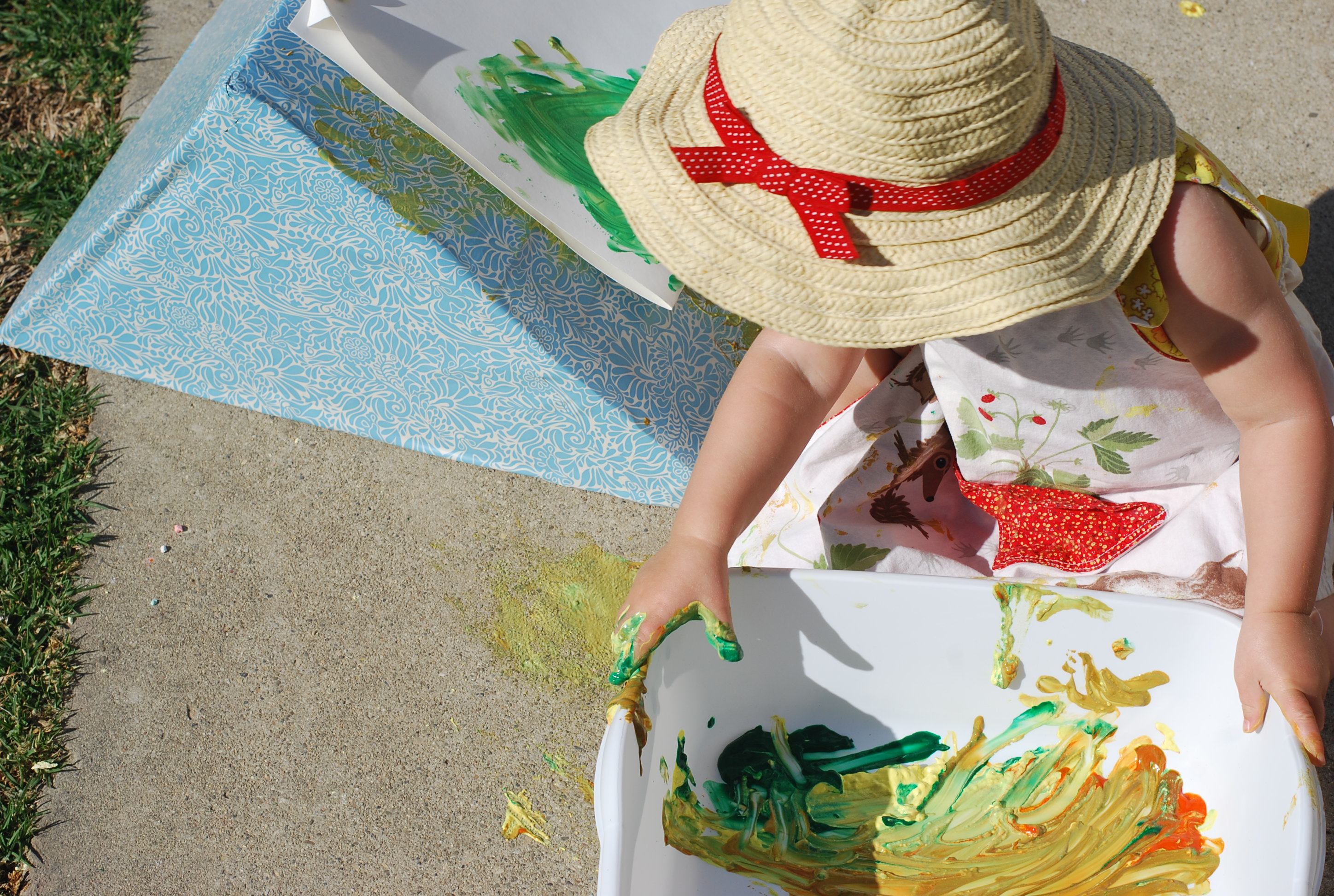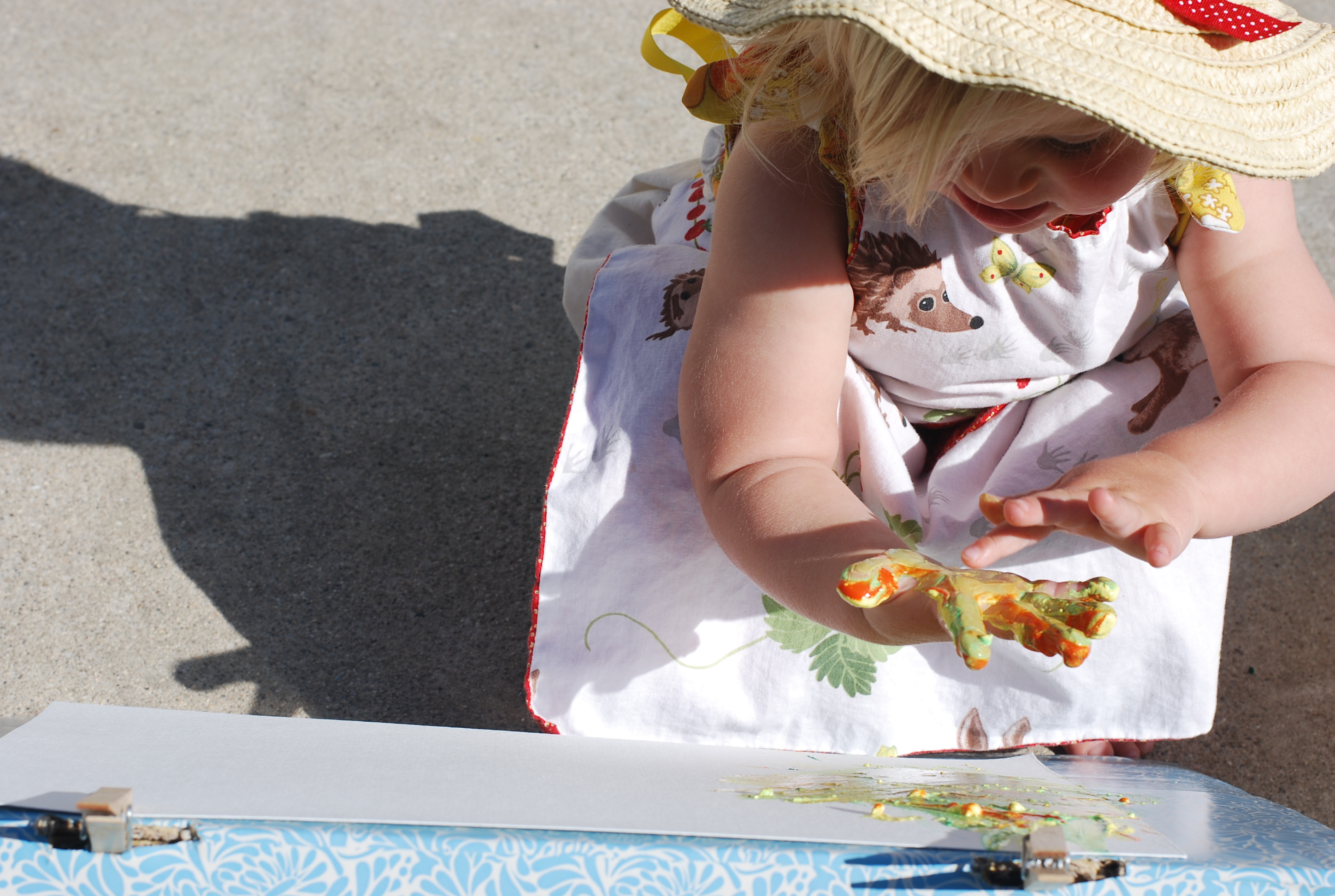 I set the easel up outside (because it was such a lovely day and for easy clean up). Ellie wanted to use finger paints and not the paintbrushes so I placed the paints in a plastic bin (her palette) and let her do her thing. As you can see, she enjoyed the process very much.