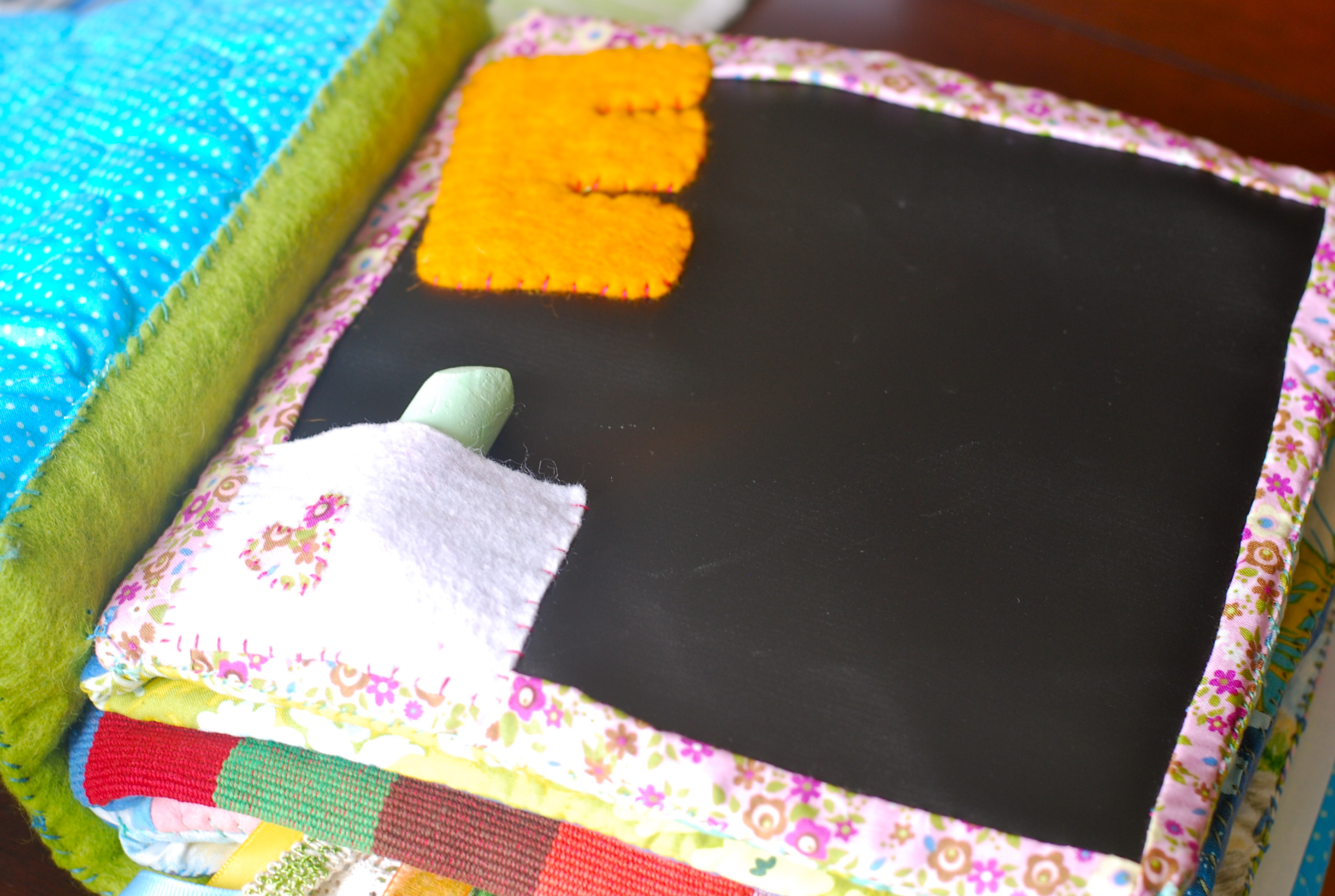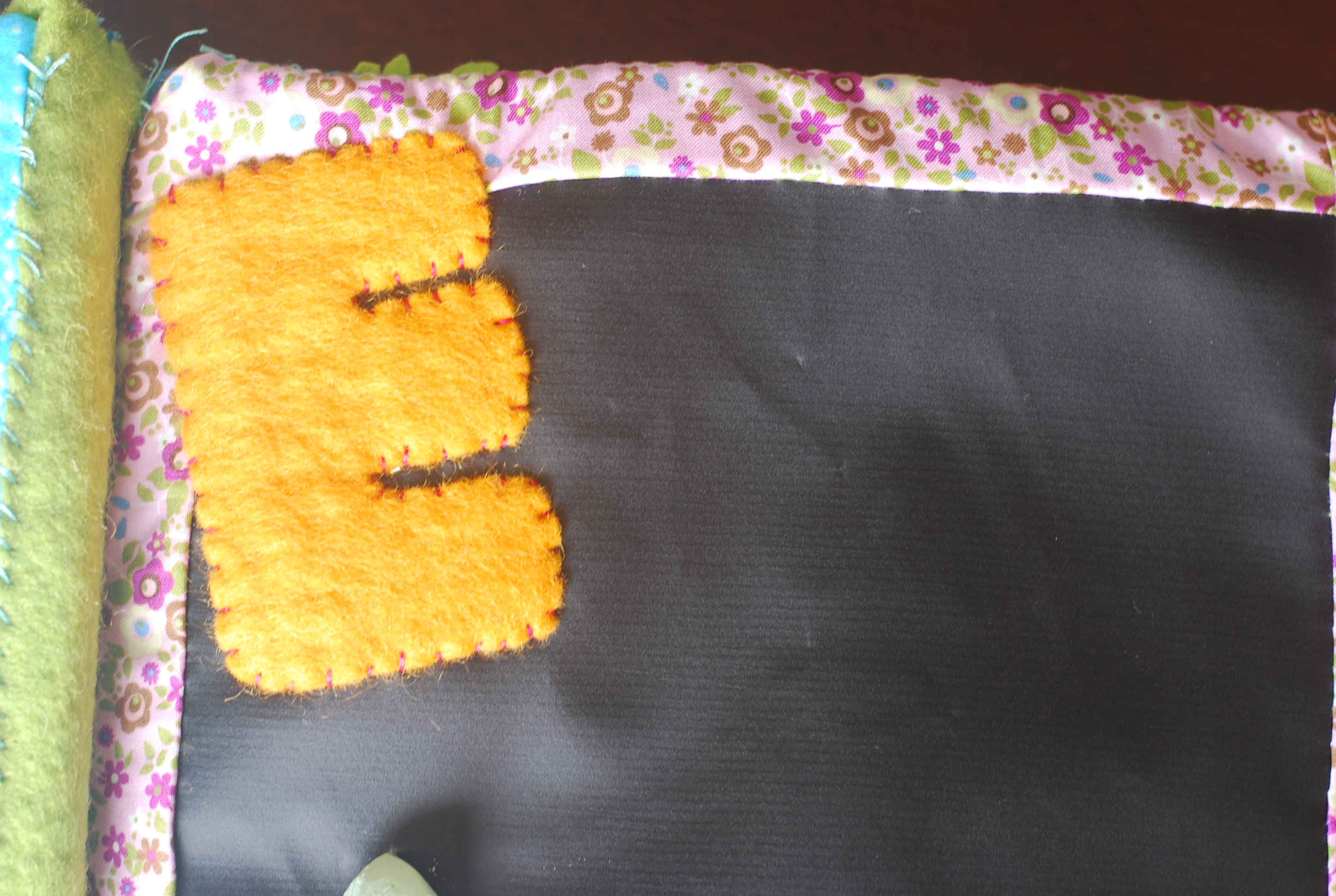 Page One is a personal chalkboard. Ellie loves drawing with chalk outside and is just starting to enjoy coloring. I found some chalkboard fabric and made a little felt E in the top corner and a little pocket to hold the chalk in the bottom corner. It was one of the easier pages, but I love the soft purples to start out with.