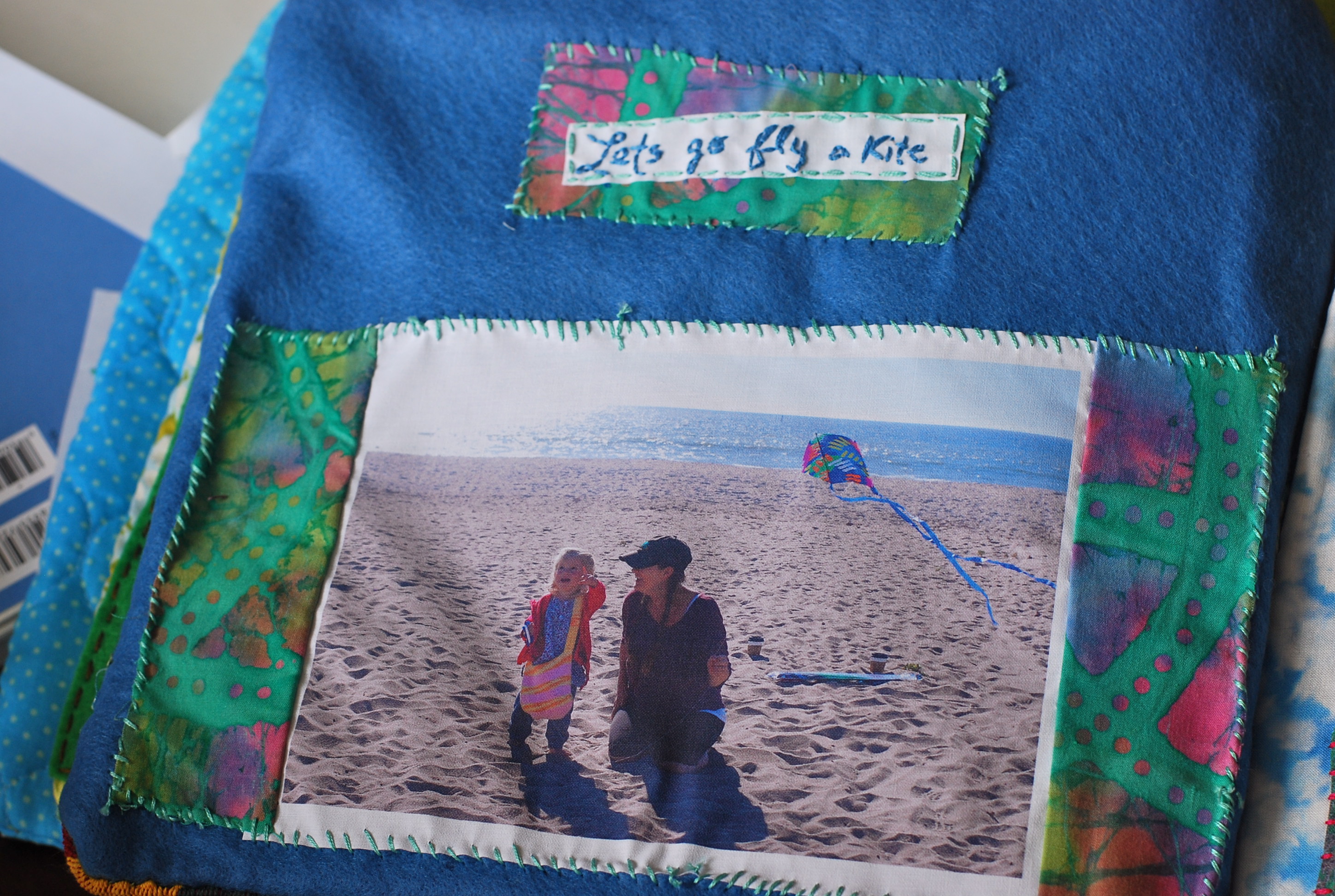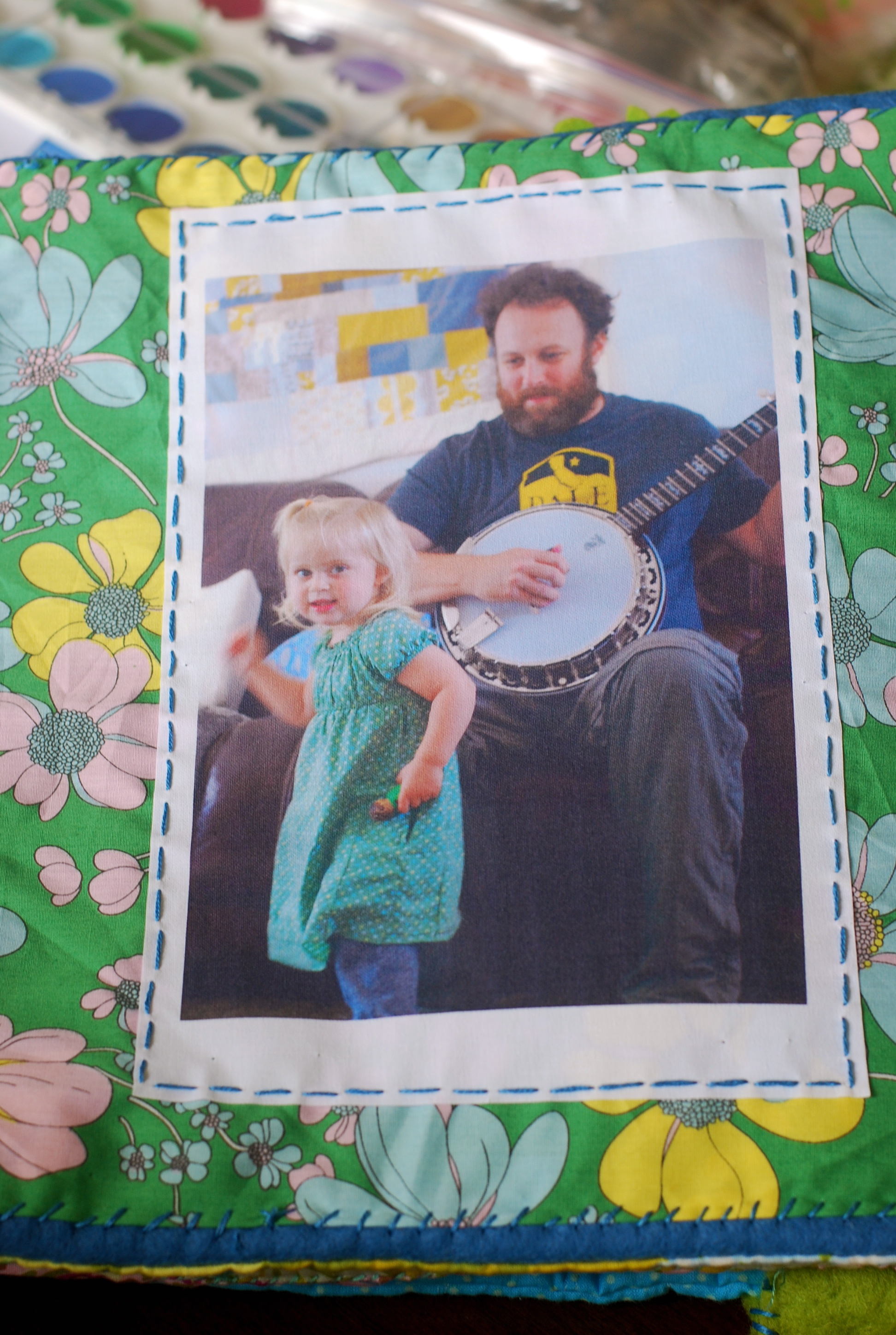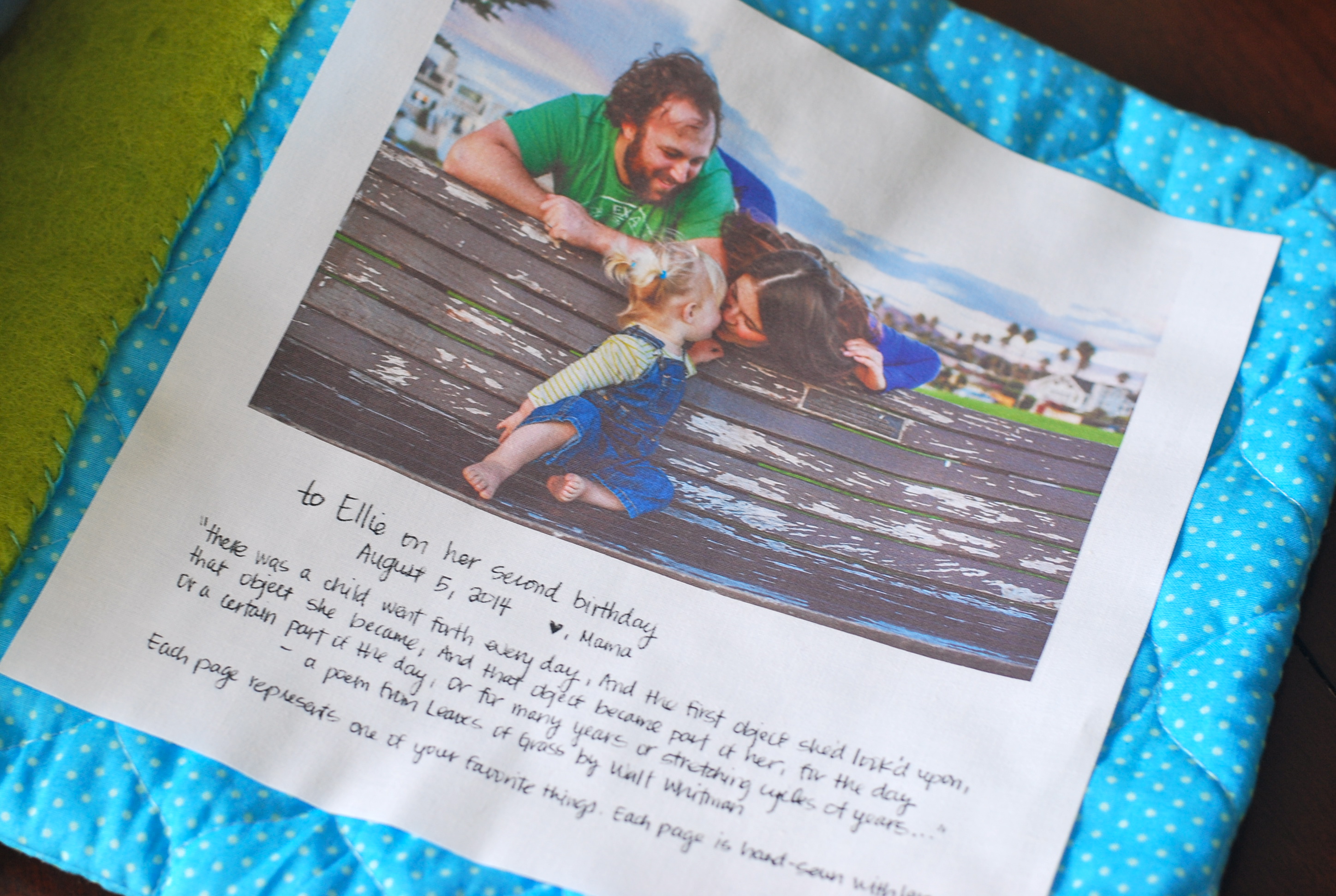 On the inside flap before you close the book, I placed a fabric photo of Jeff and Ellie and I (taken by this incredible photographer). A little inscription for the birthday girl.