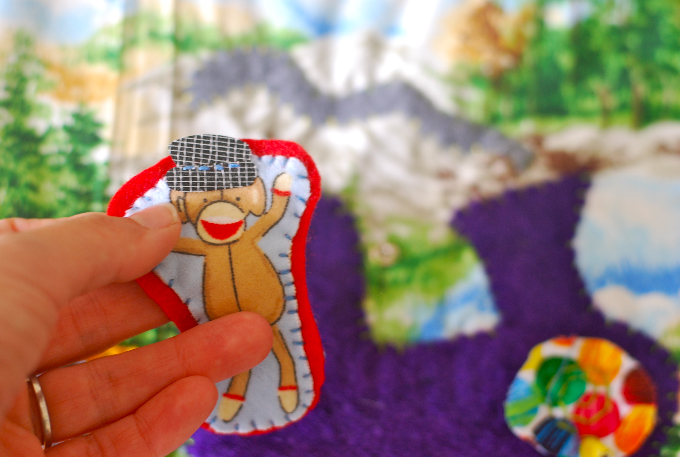 The sock monkey train conductor comes off of his post as well. He’s attached by a snap for easy removal.