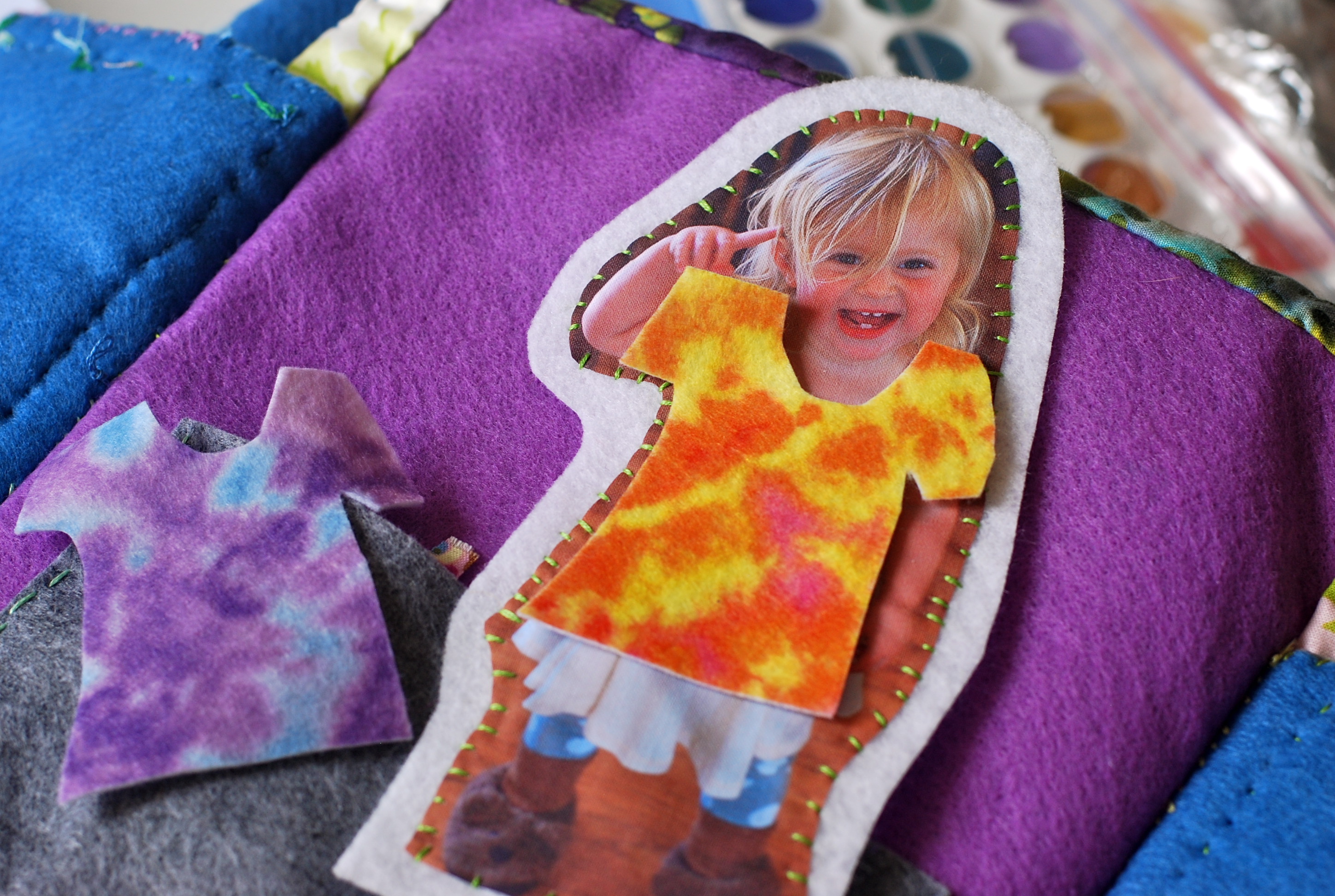 The last page is an Ellie fabric doll page. Kind of like her own personal paper doll kit. I printed out a photo of her on fabric paper, fashioned a “fabric doll” and made several different articles of clothing. In these photos I haven’t quite finished it yet, but Ellie will be able to attach the clothes to the “Ellie doll” with velcro. And everything fits into the little pocket closet.