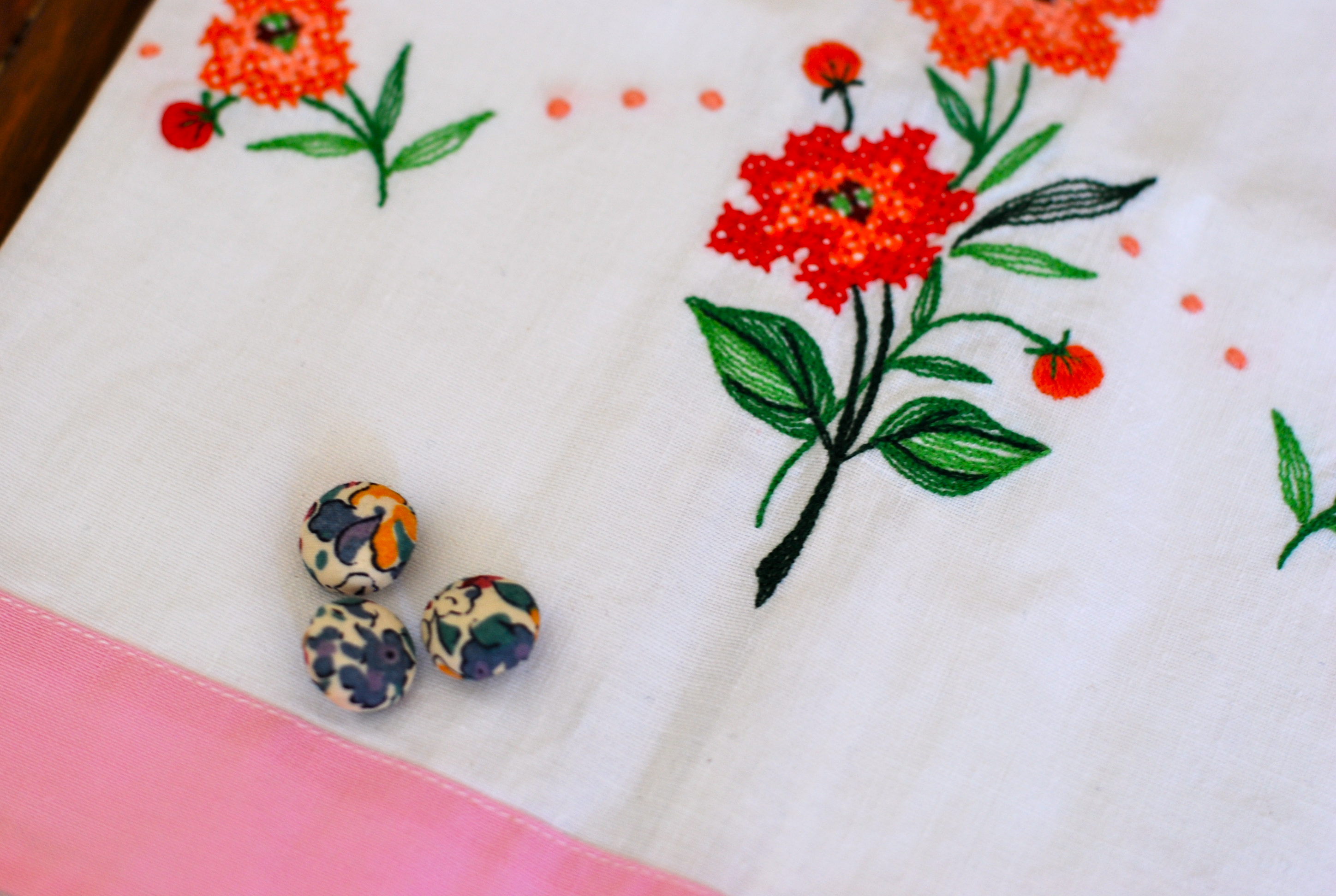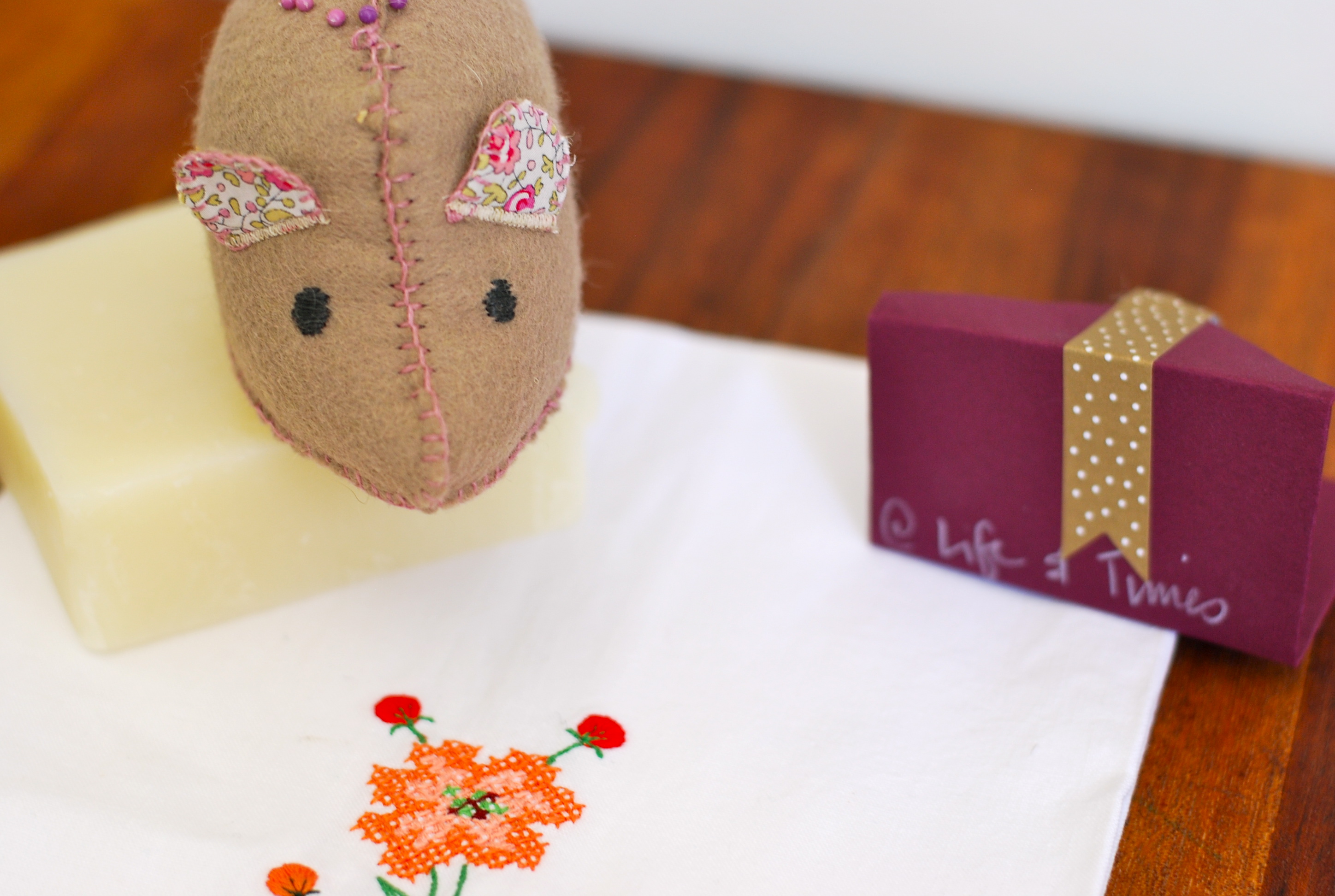 I received these beautiful gifts in the mail the other day from the blogger swap. (Here are the gifts I sent off). The lovely Amanda from The Life and Times of Julian and Amanda made them and I am so taken by every item! As soon as I opened the box, Ellie squealed for the hedgehog pincushion (she’s calling it a mouse). So, I took out all of the little pins and she carried it around all afternoon. I was finally able to snap a few photos of everything for today’s post. The dishcloth is exquisite! It will be lovely to hang in the kitchen and the soap, smells amazing. The buttons are darling! And they will force me to finally make Ellie a top. Or maybe I can convince my mom to make something for her with them? Or a knitting friend? It really was lovely getting all of these goodies! This swap was a delightful way to end the summer. Thank you so very much Amanda!!