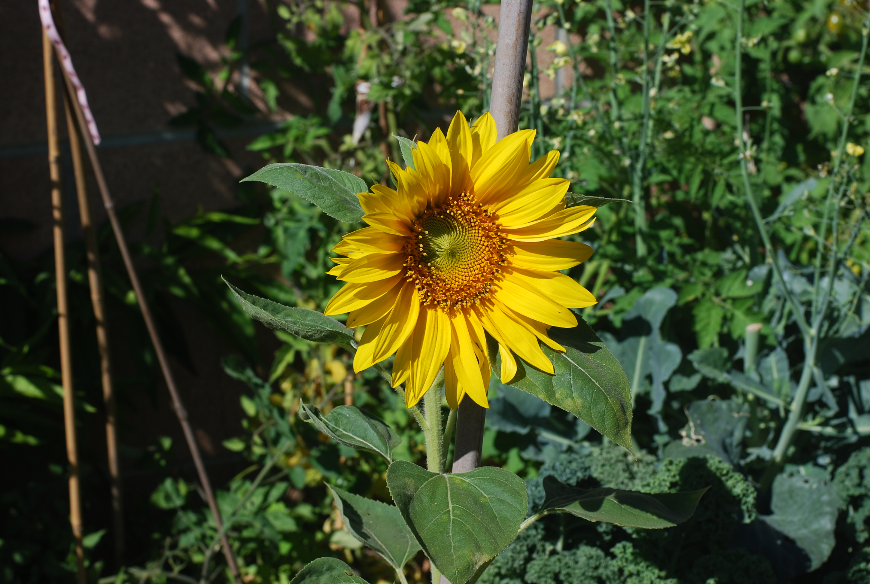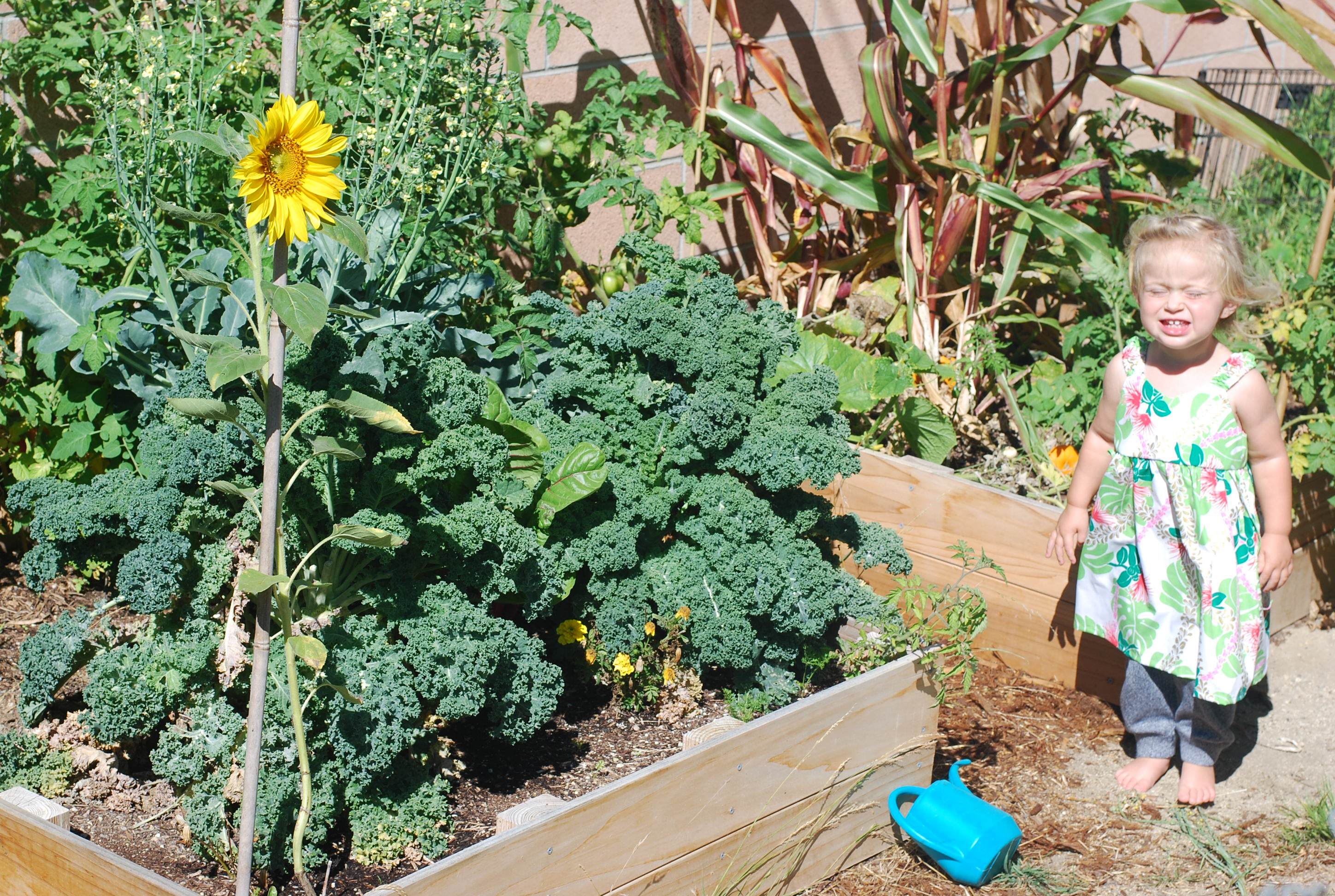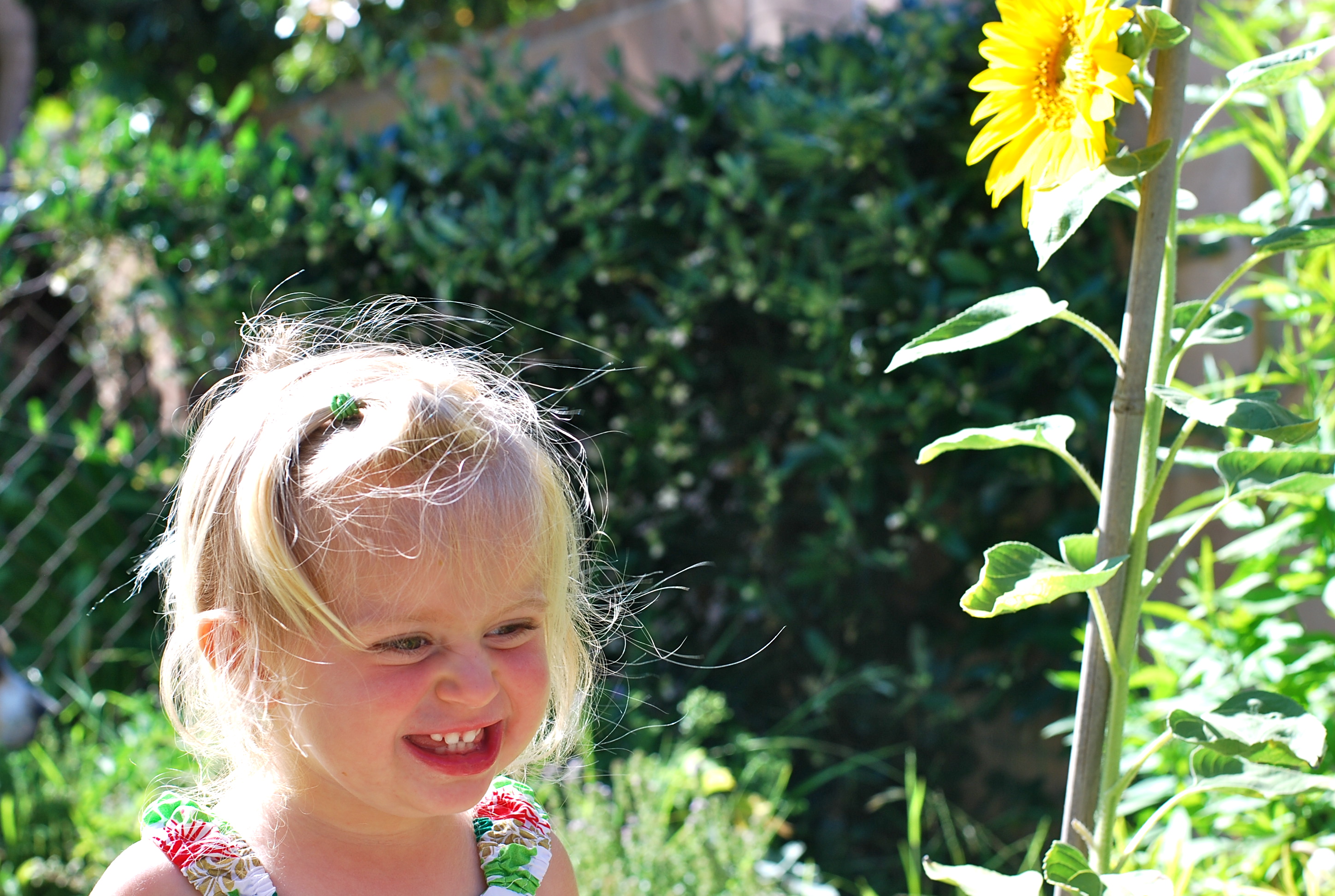 The August garden is finally providing. We have tomatoes galore! (Ellie ate about 12 that she had picked herself today). The kale just keeps growing and growing. It seems we’ve finished our corn. Now I’m looking into what to do with those dried husks. We have a little bit of swiss chard for those morning omelets and lots of herbs still growing strong and keeping the honey bees happy. The Jack-be-little pumpkins are almost ready to be picked and the hops! Those glorious hops! I caught a glimpse of them in the afternoon sun the other day and had to run out and photograph them. Lush and green (even in this brownish land of California) and reaching all the way up to the top floor windows of the house. It’s a fun, full of life month in the garden. And as you can see, Ellie’s library sunflower finally bloomed. She’s one happy gardener.