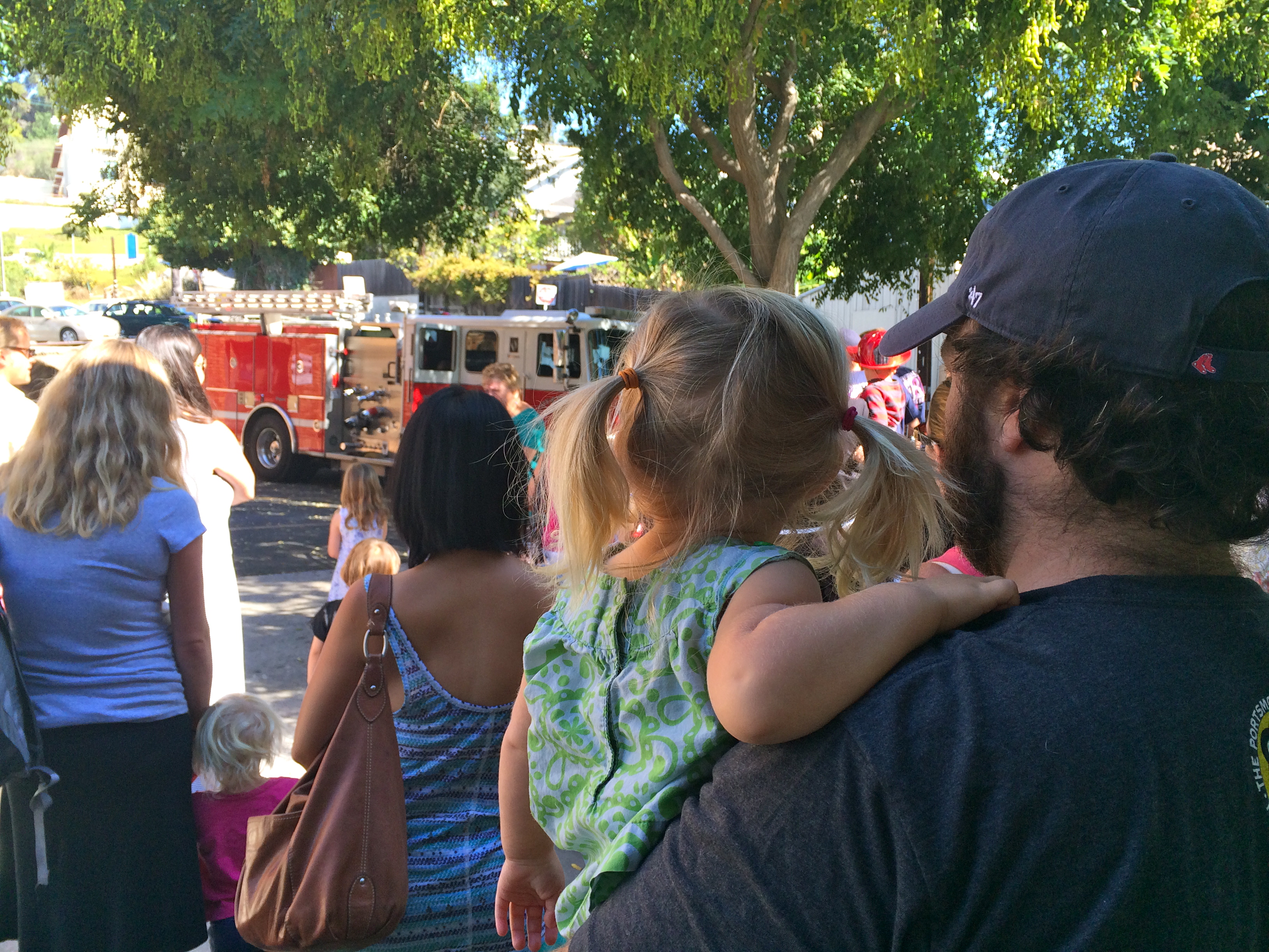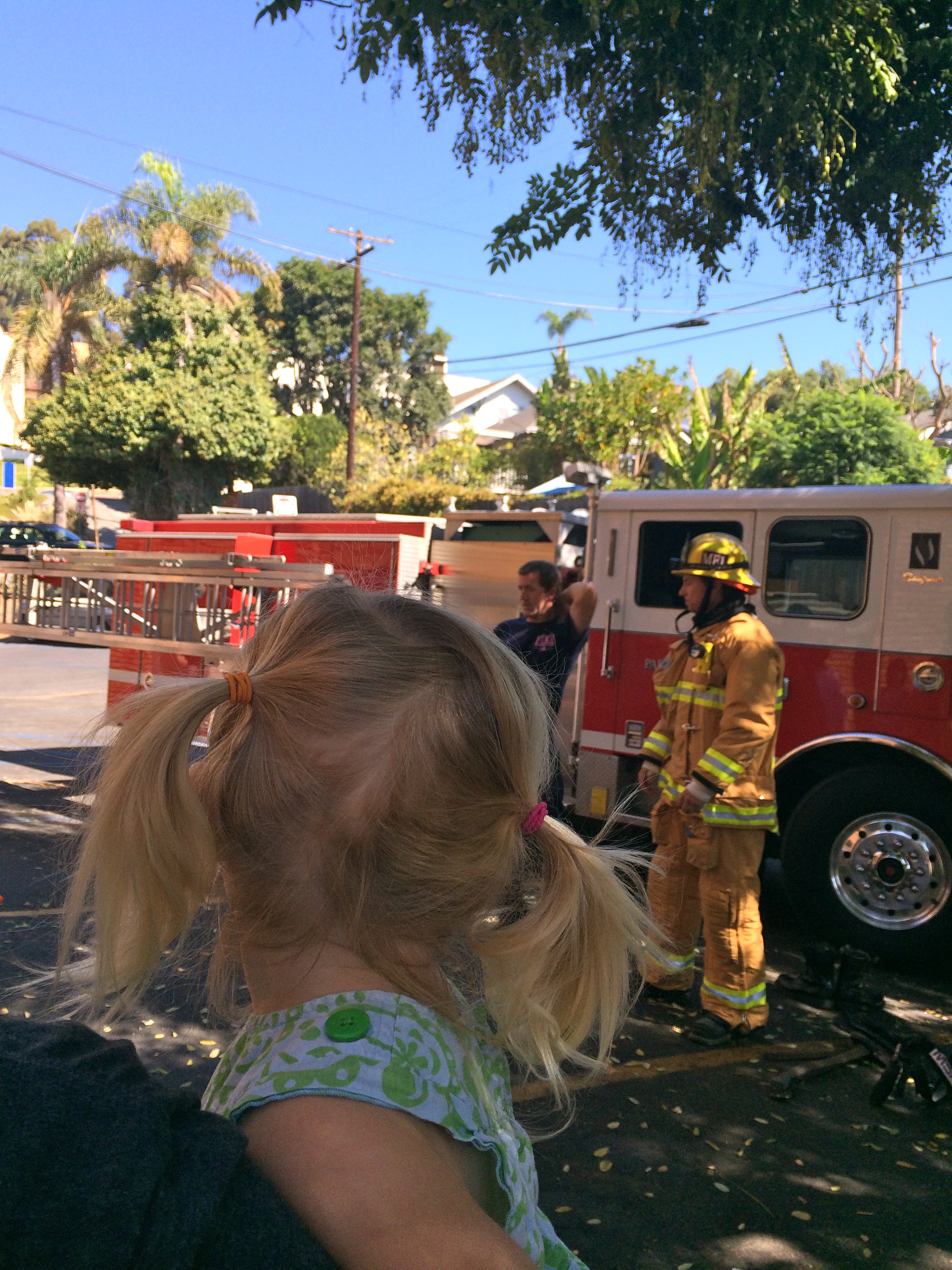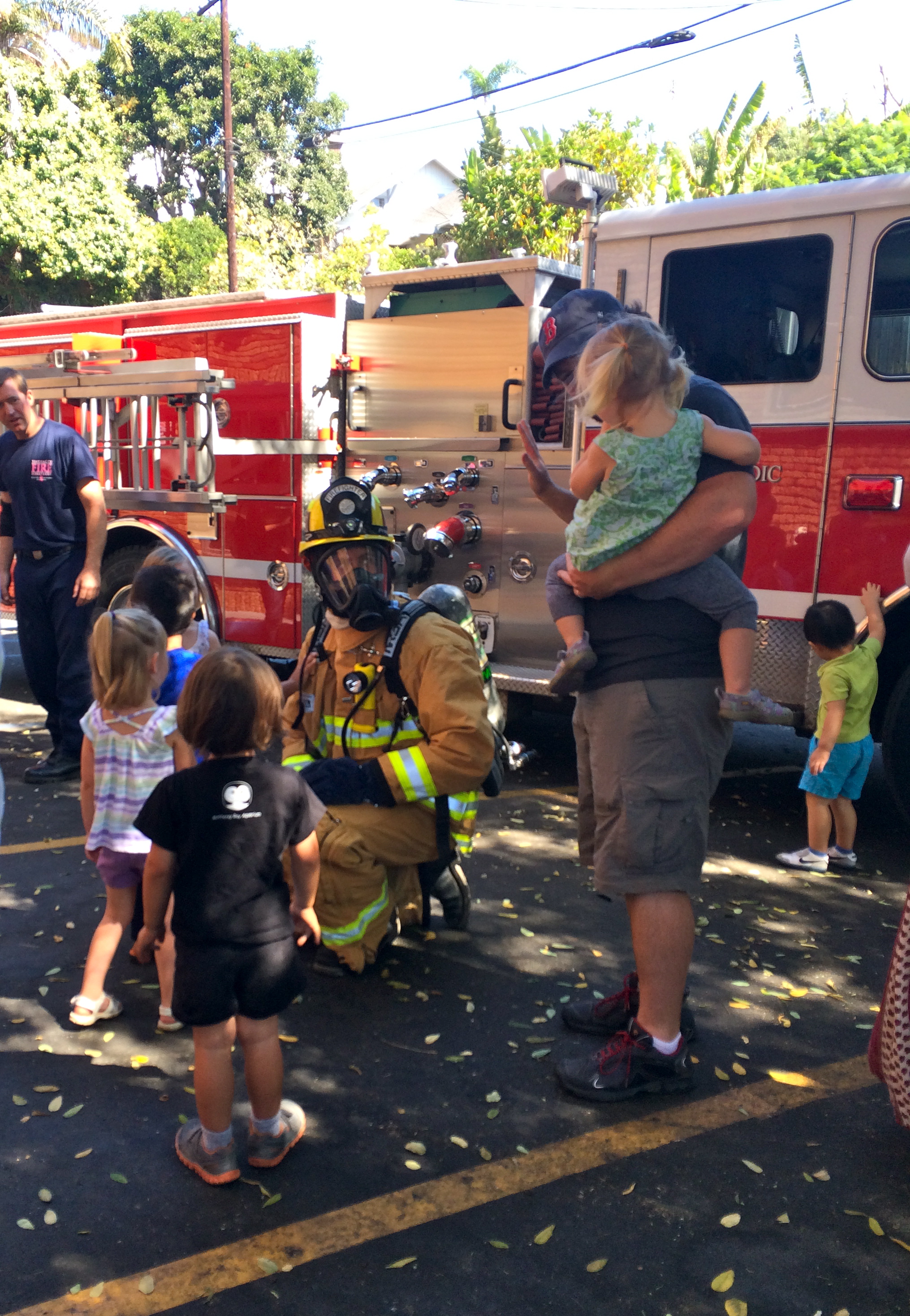 This week on library day, I had a doctor’s appointment, so it looked like we wouldn’t be going to the library. Jeff stepped in and said that he would take Ellie to the library, so not to disrupt her regular routine (what a Dad)!. Well when the day came, my appointment ended up getting cancelled, so after hyping up “Daddy going to the library”, Jeff decided he’d take off the morning and go anyway. So the three of us headed down for Dada’s first library visit, and what an exciting visit it was. It turned out that the local firemen were coming to talk to the children about being firemen. The chief read the children a story and then we all got to check out the fire truck and watch a fireman put on all of his gear. It was very exciting! Ellie has been talking about it all week and asking to read fire truck books at bedtime. We loved that Dada took off work to join us at the library and we all enjoyed our morning with the firemen!!