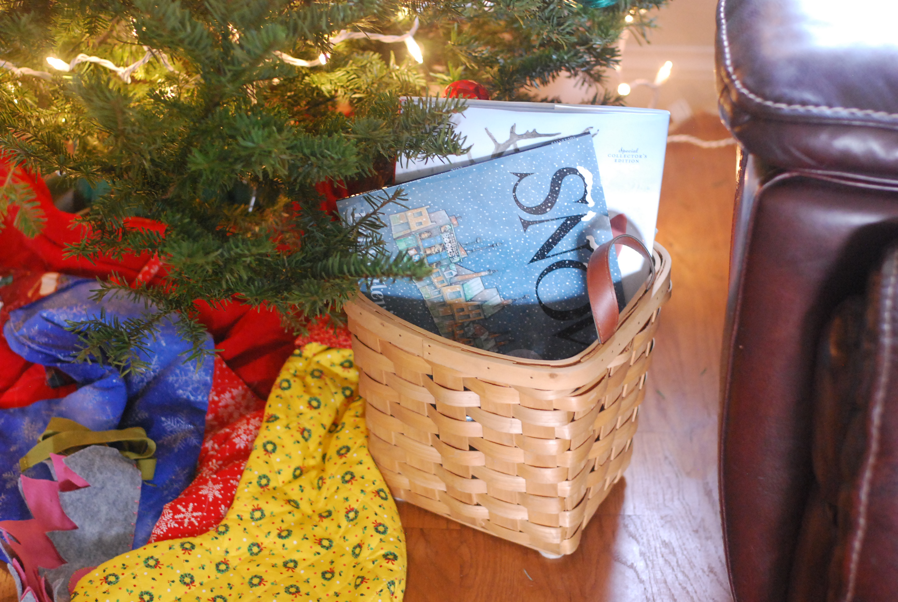 This year we decided to have the “Christmas book gnome” bring Ellie a book every night before Christmas. He leaves it in this basket under the tree. (Being a preschool teacher for so many years, I have a stockpile of winter/Christmas books and I thought, what fun to wrap each one for her this year). Next year, we will only get one new Christmas book to add to the basket, maybe on the first of December.