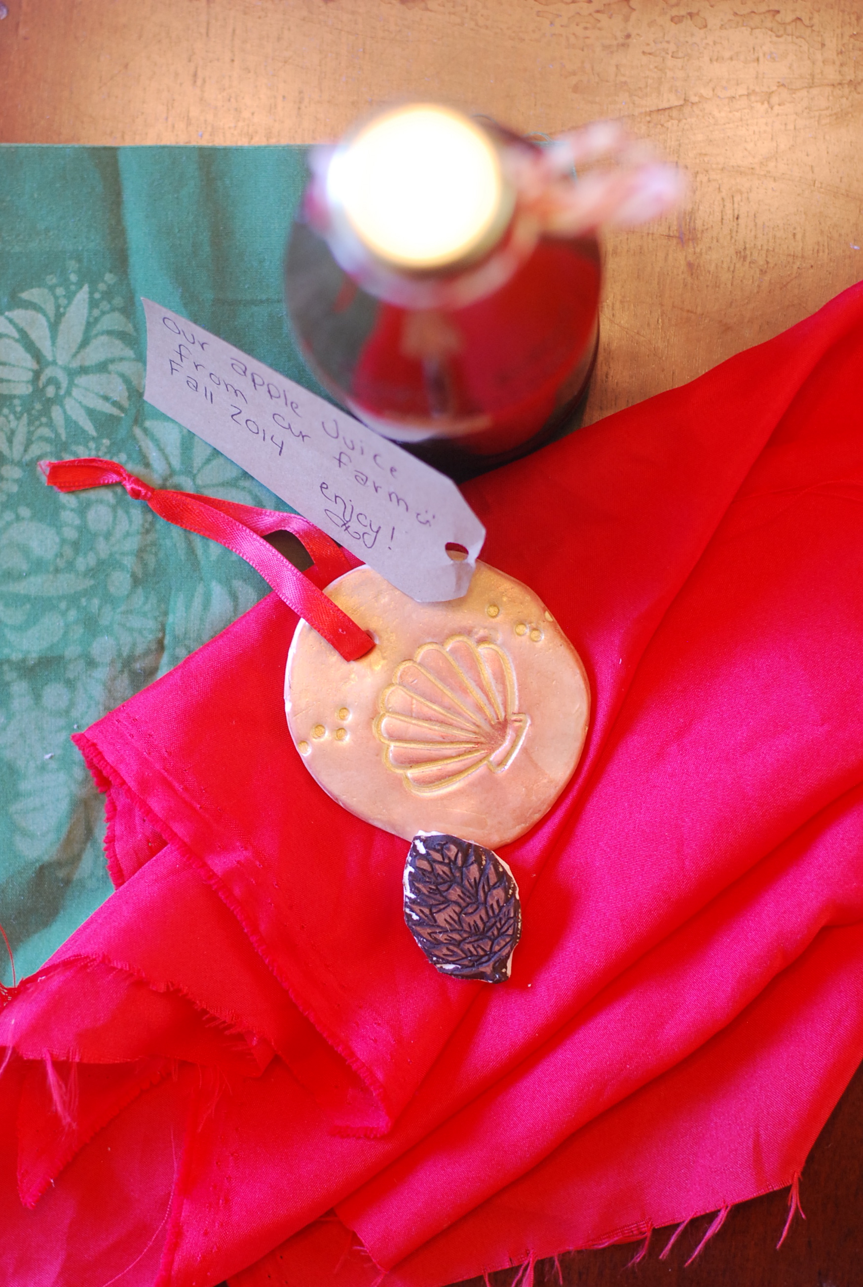 A sampling of her family’s fresh pressed apple juice, a lovely clay handmade ornament and one of Jenny’s coveted hand-carved stamps. All wrapped up in lovely fabric. It was such a special, wonderful gift. Thank you Jenny!!! I truly was surprised and touched to receive all of this!!
