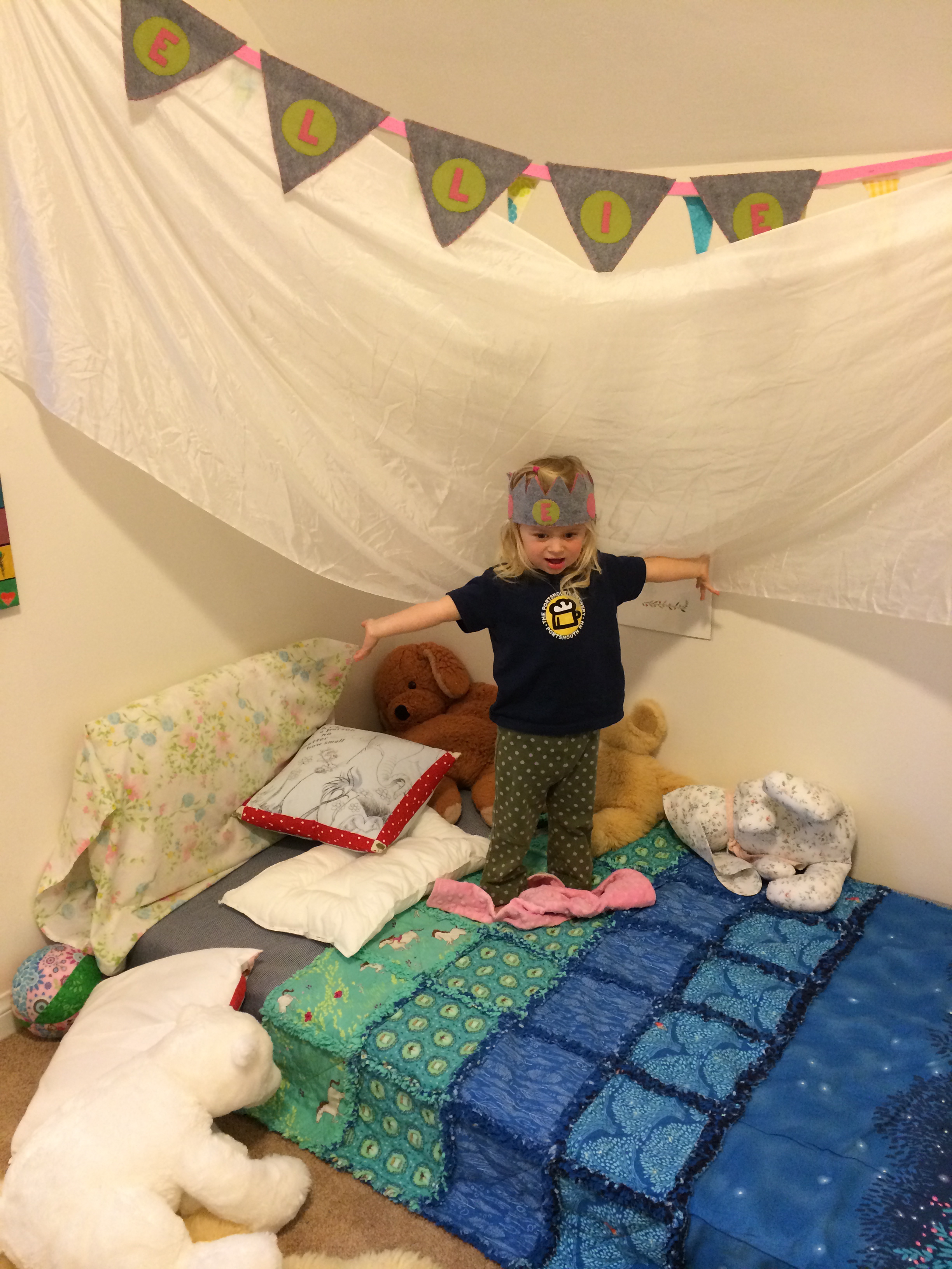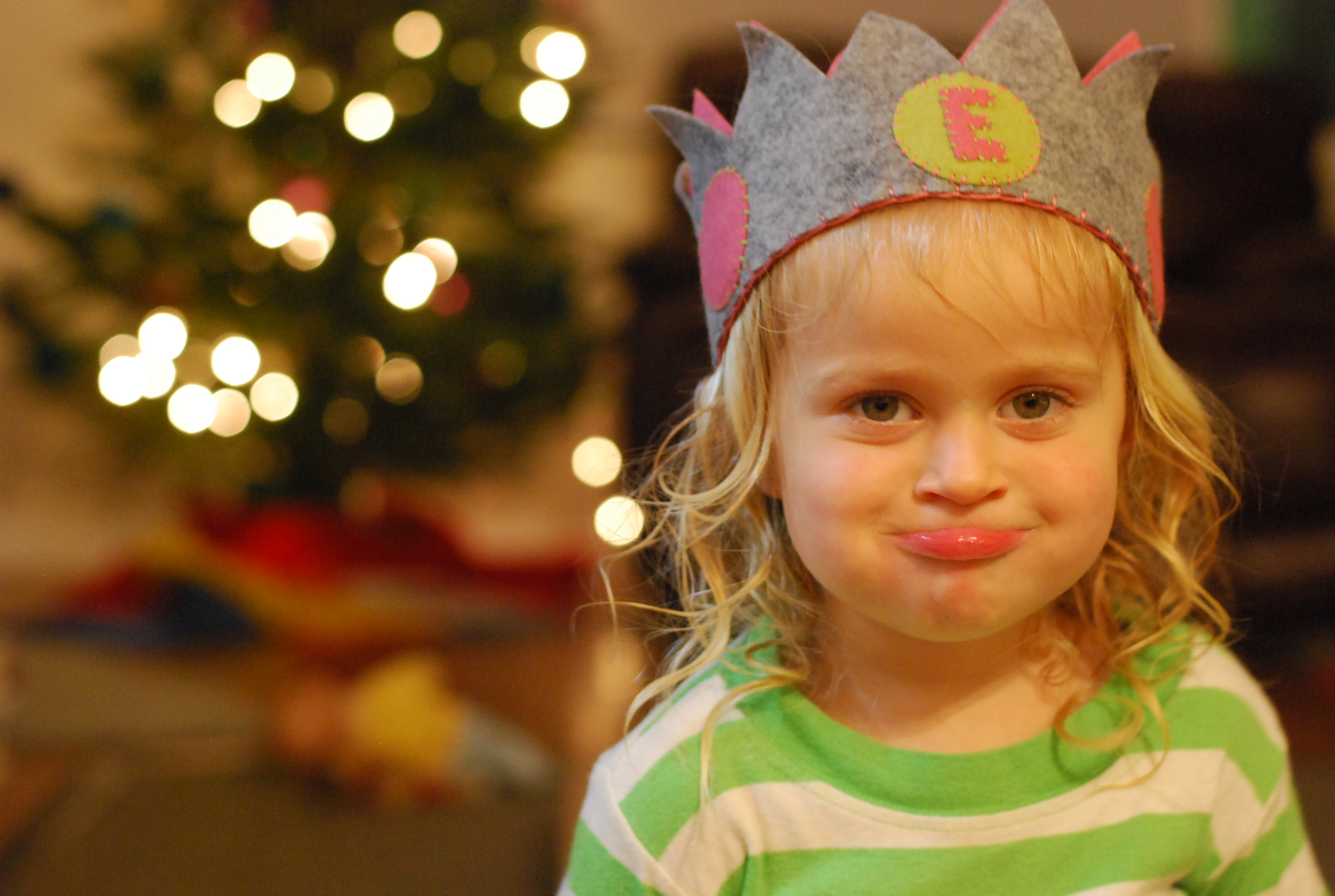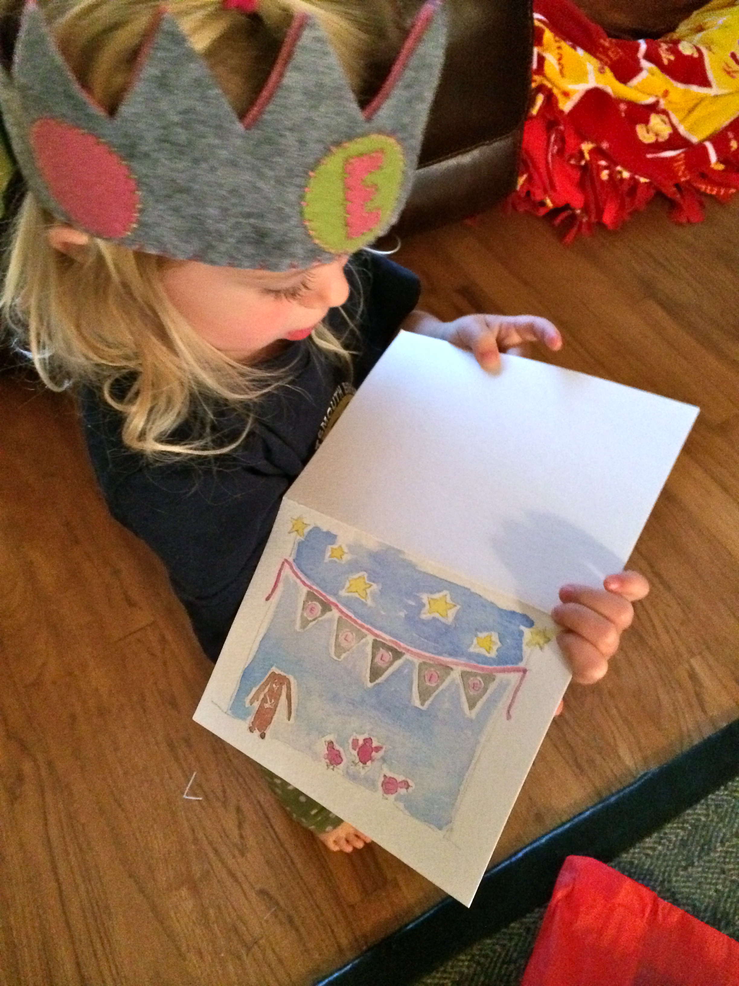 Ellie received some happy mail too, a couple of weeks before Christmas. I kept meaning to share about it here, but never got the chance. Another dear friend whom is part of my “tribe” I’ve talked about and an amazing writer, did a little swap with me. I made her son a playmat and she made Ellie a beautiful felt name banner! It’s gorgeous and Ellie was thrilled to get it. She was even more taken with the extra goodies my dear friend sent; a felt crown and a beautiful hand painted card! Ellie is a fan of dressing up, so this crown has had a lot of wear already.