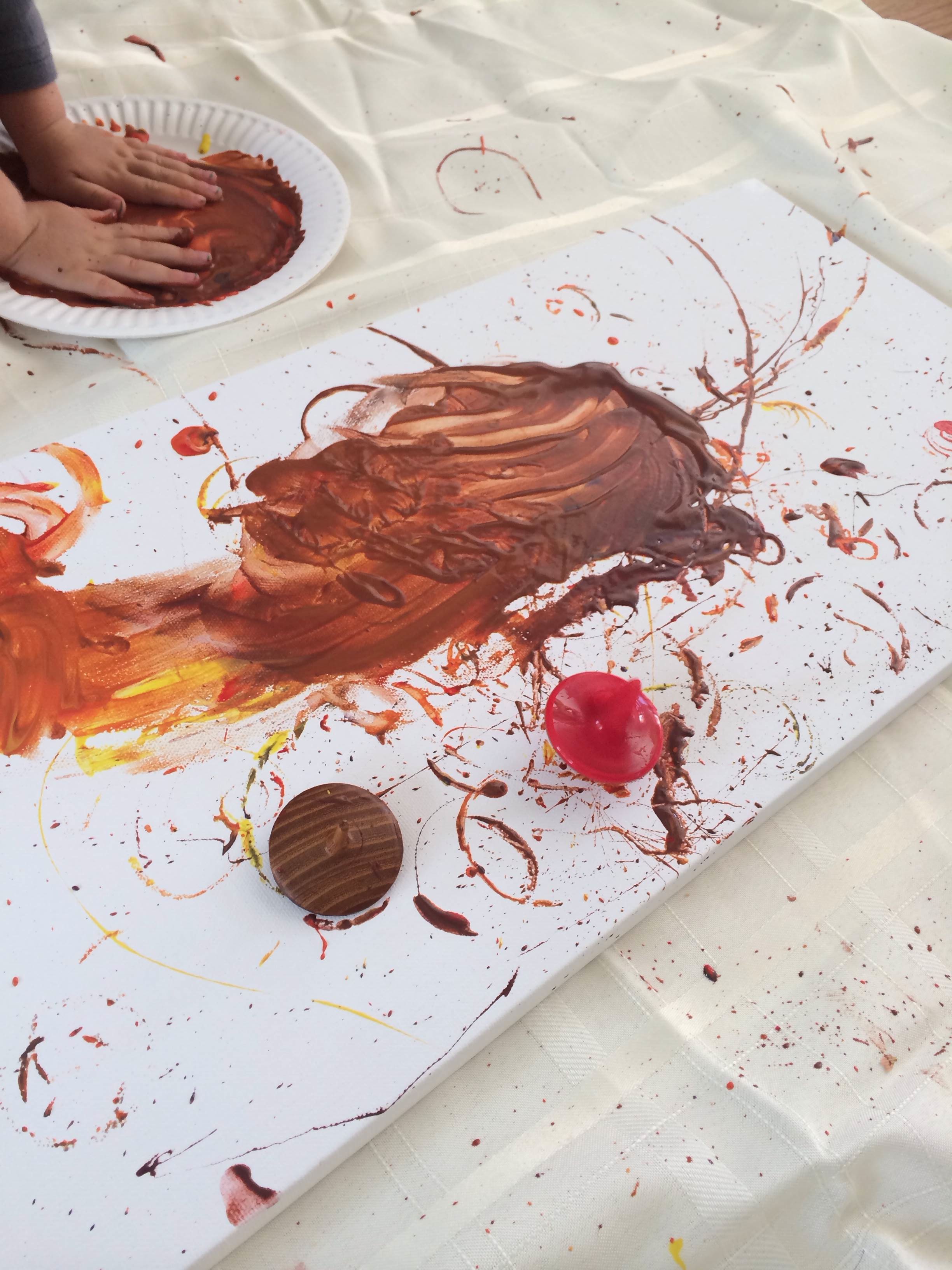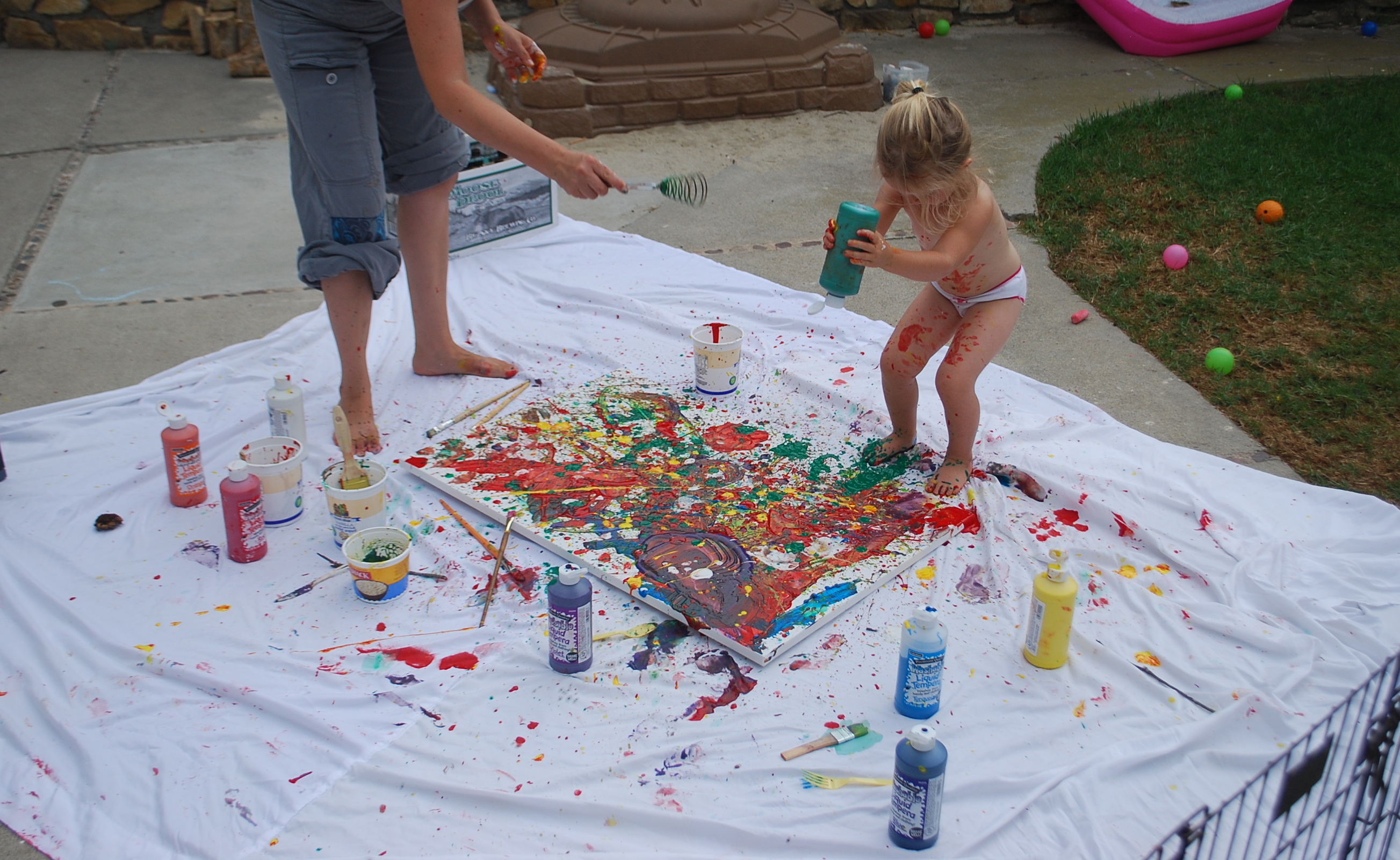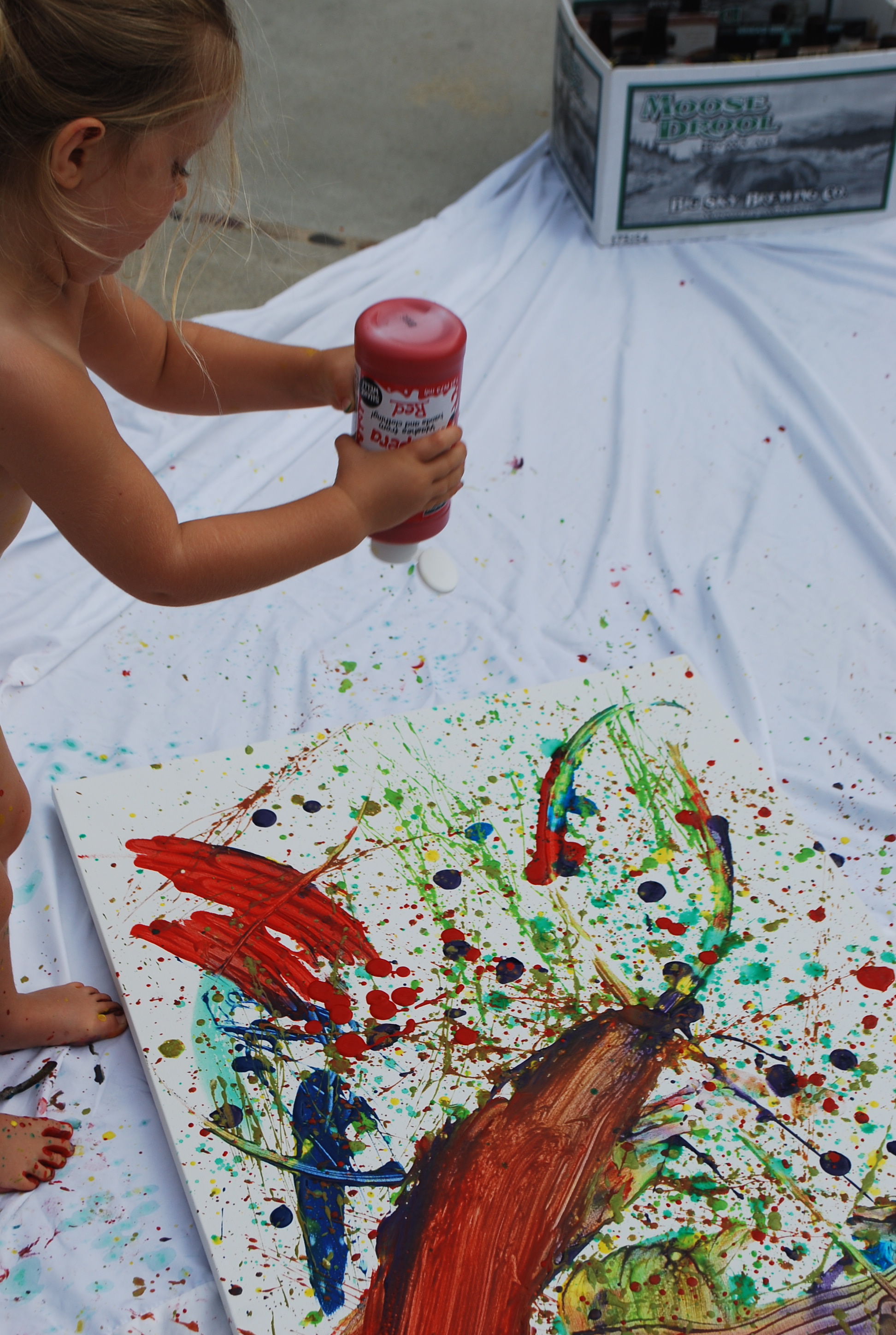 We read a fantastic book about Pollock called Action Jackson. Great illustrations and Ellie was captivated by the rhythm of this story. I also let her watch a you tube video of Jackson Pollock actually painting. I found these little cartoons about artists. They are a bit jarring for my taste but, I liked that they introduced artists in a way that Ellie seemed to understand and enjoy, even if I didn’t quite appreciate the noisy cartoonish-ness. The next couple of days, I set up a few painting like-Pollock activities. We did a full-scale large canvas: