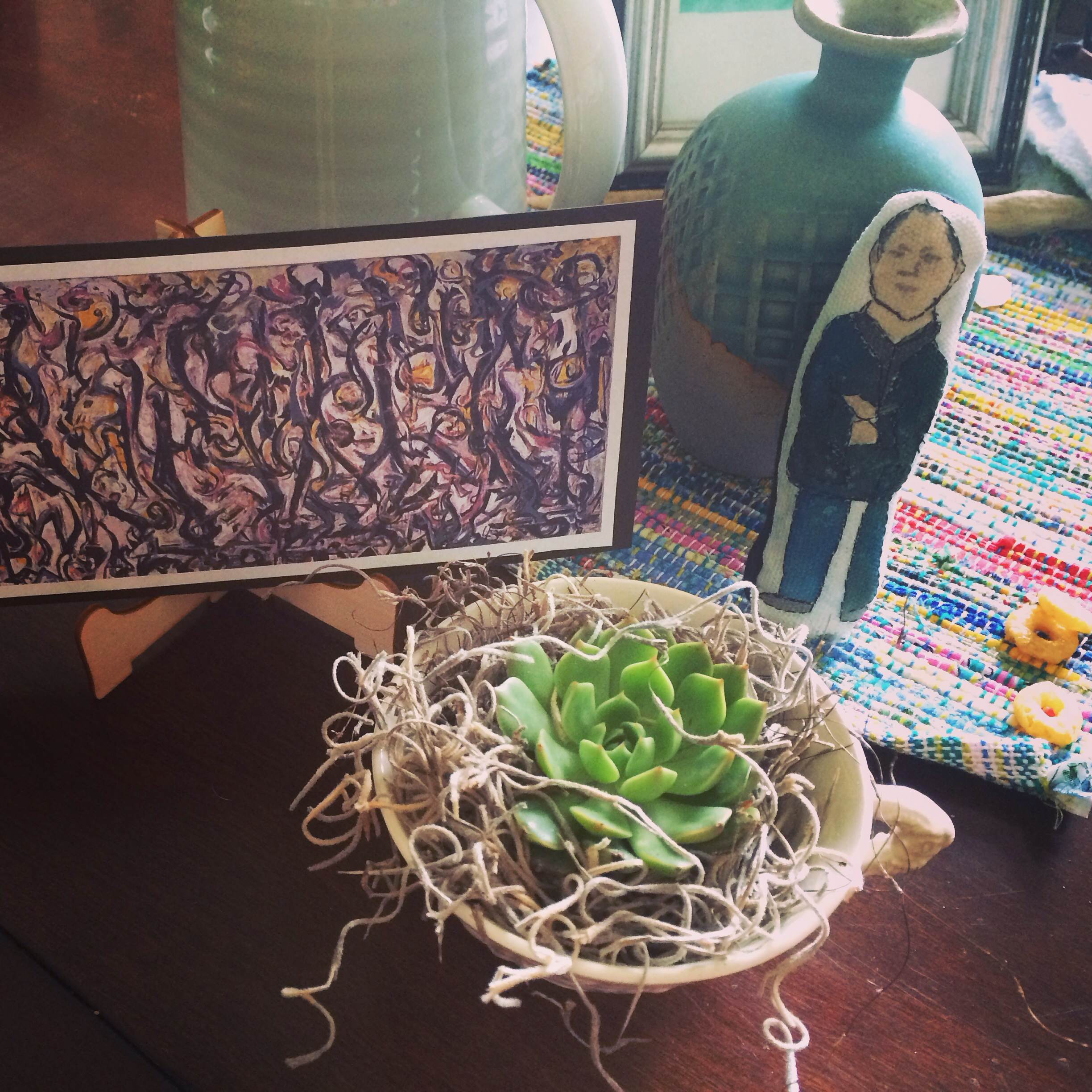 Ellie has loved this whole “Artist for tea” thing. Van Gogh is part of the family now. He goes to Whole Foods, rides along in the car and talks to Ellie daily. We were in Michael’s the other day and she saw a Van Gogh coloring book and immediately knew who it was. But these past few days, Ellie has asked if “someone new is coming? A new artist”. So, we’re moving on. Van Gogh went back to France and Jackson Pollock has come to stay with us for a while. (and yes, those are pumpkin O’s Ellie has shared with Jackson).