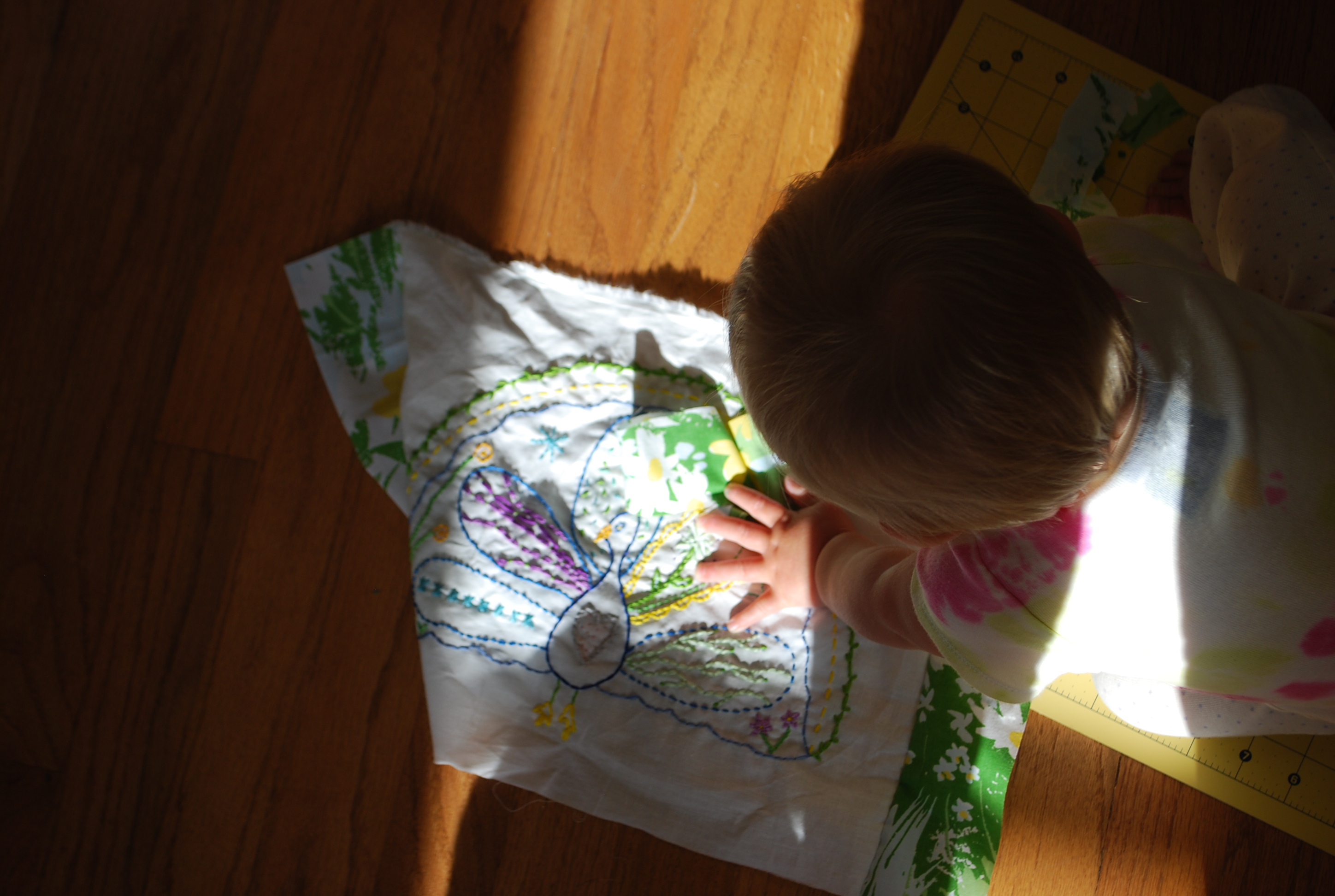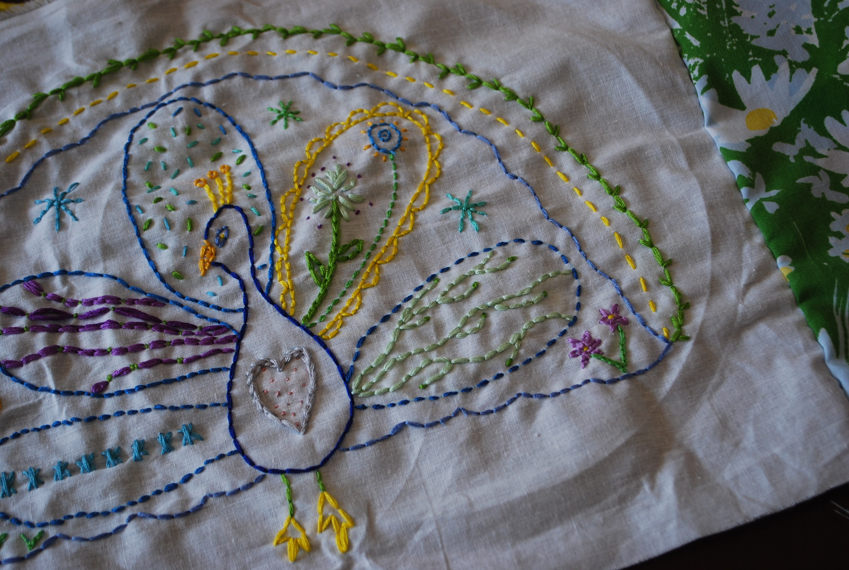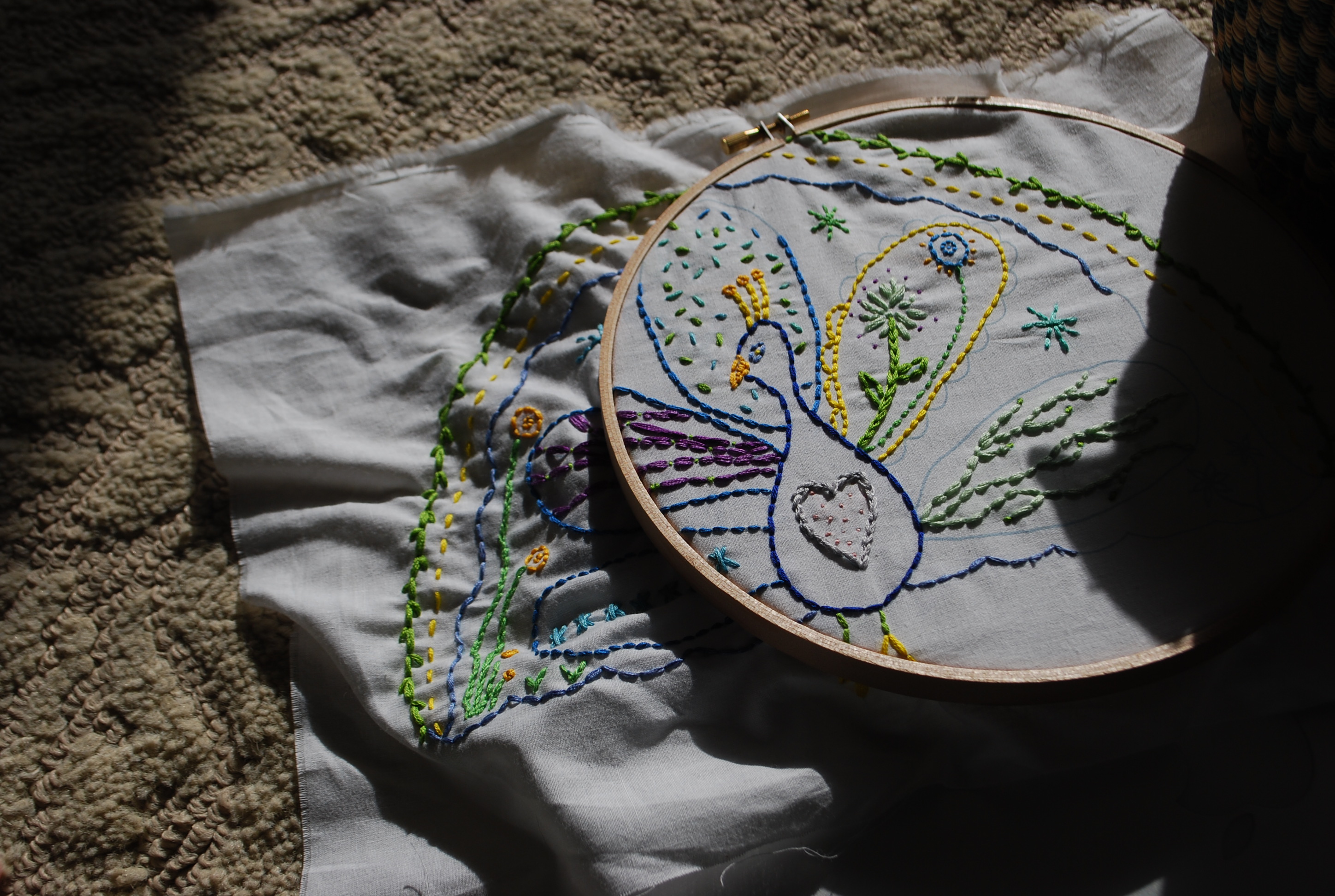 MAKING: Yay! I finished embroidering the Peacock! It was so much fun and I am hooked! (I wanted to post earlier today but I’ve been busy walking the streets with a teething baby, so these pictures are a bit shadowy at the end of the day- I kind of liked the way they came out). But, I managed to get it done here and there and I even added some fabric to the ends. I’m very much looking forward to framing my Spring Peacock.