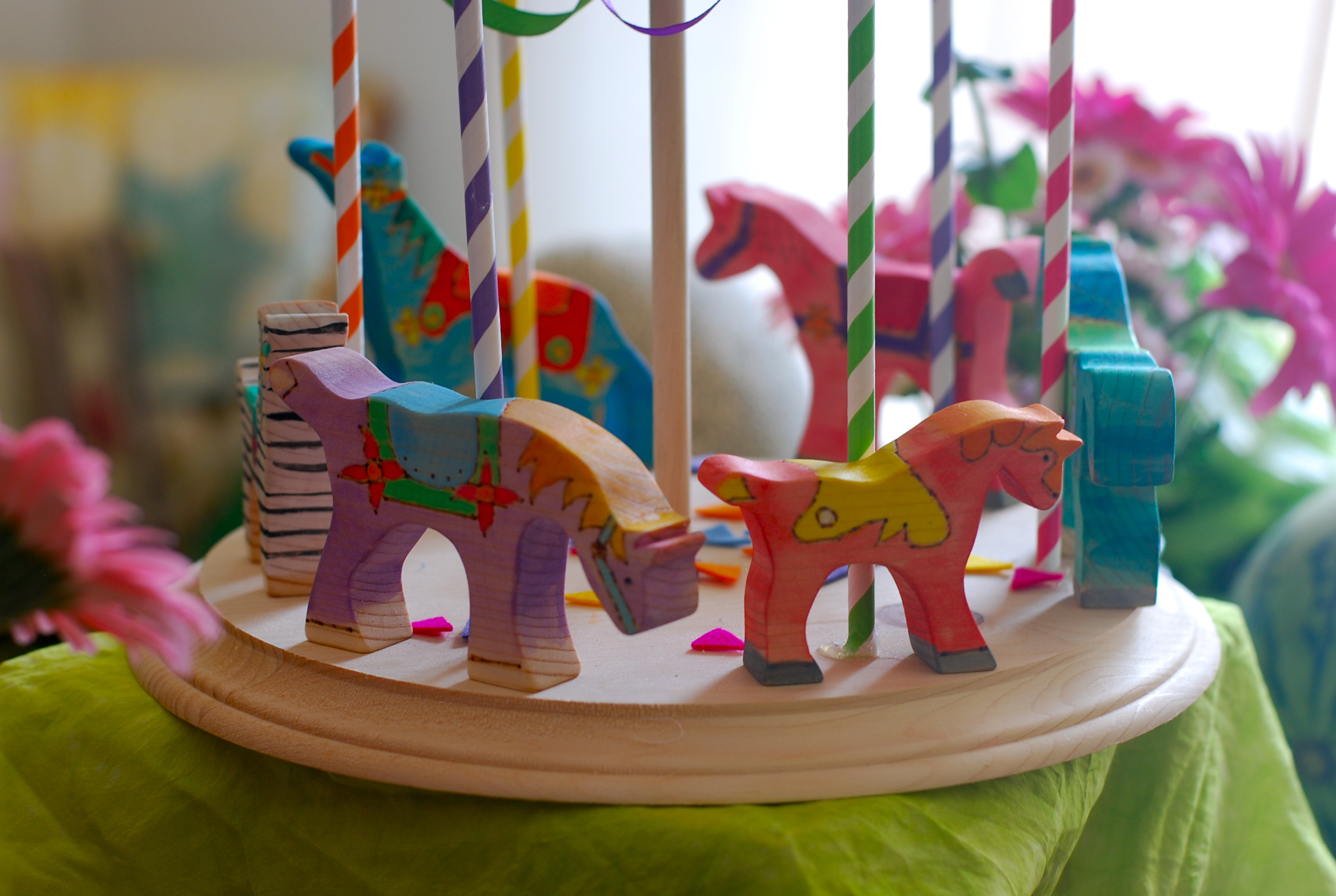 I bought blank wooden horses from here and sanded them till their edges were smooth and rounded, wood burned the designs on each of them and then used watercolors to paint them. Lastly, I sealed them with a non toxic sealant and rubbed them down with beeswax so give them a softer texture. I was very happy how they turned out and Ellie has been carrying them around all weekend (they aren’t attached to the carousel).
