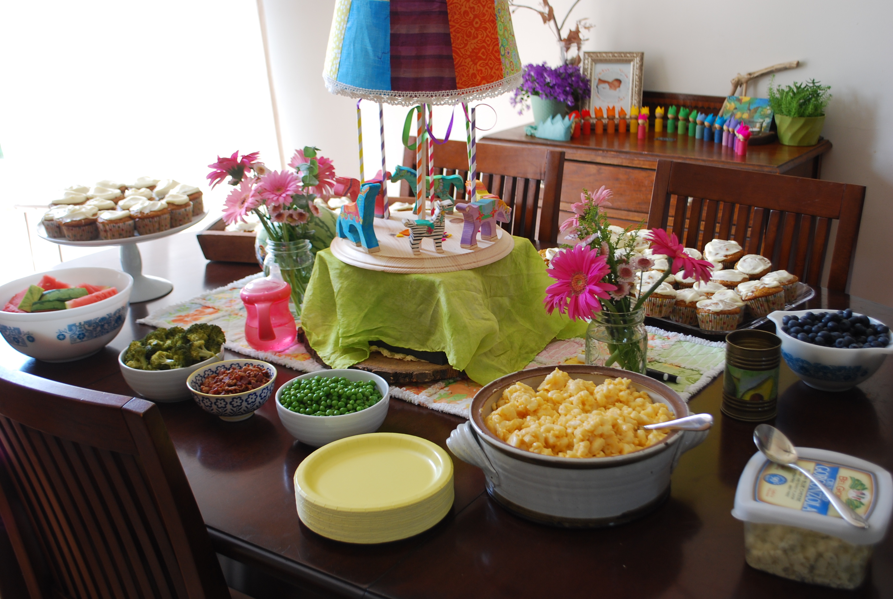 I could not get a decent shot of the centerpiece I made (so forgive the darkness in this photo). I worked on this centerpiece for weeks to get it right. Last year, my mom made hot air balloons as the centerpiece and this year, since one of Ellie’s most favorite things is riding the carousel and another favorite book of hers is Up and Down The Merry-Go-Round, I thought I’d try to recreate a little merry-go-round for her.