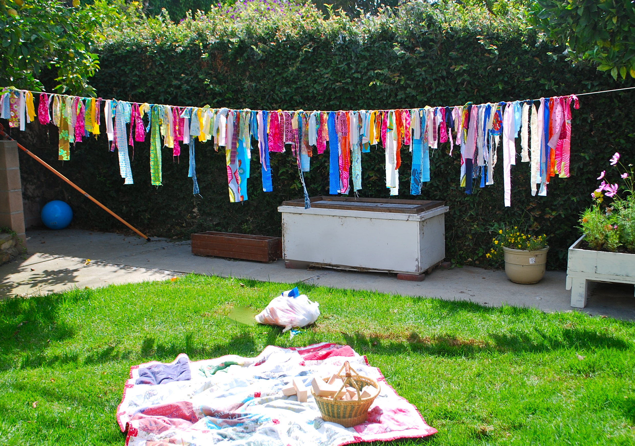 A line full of fabric scraps to brighten it up outside.