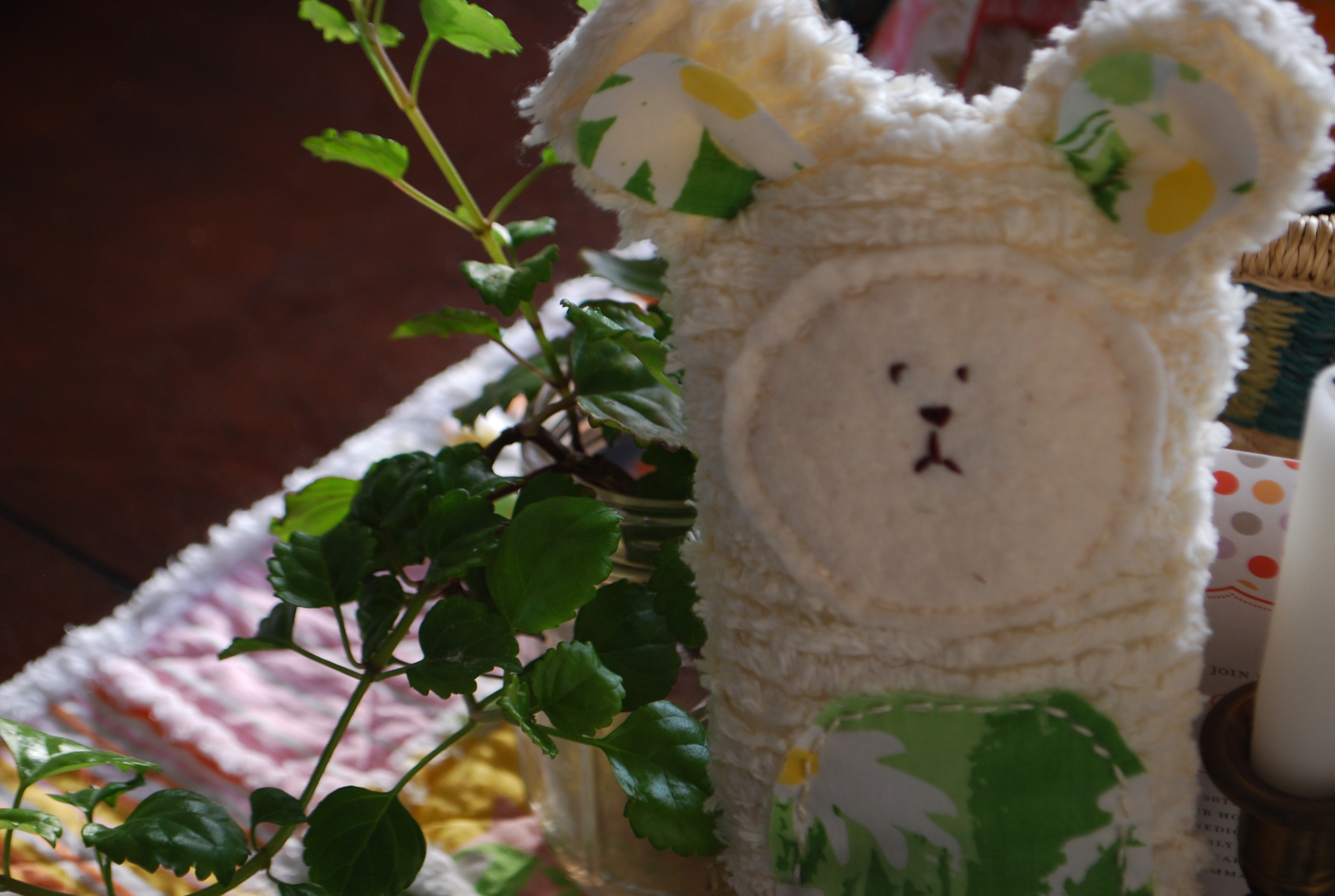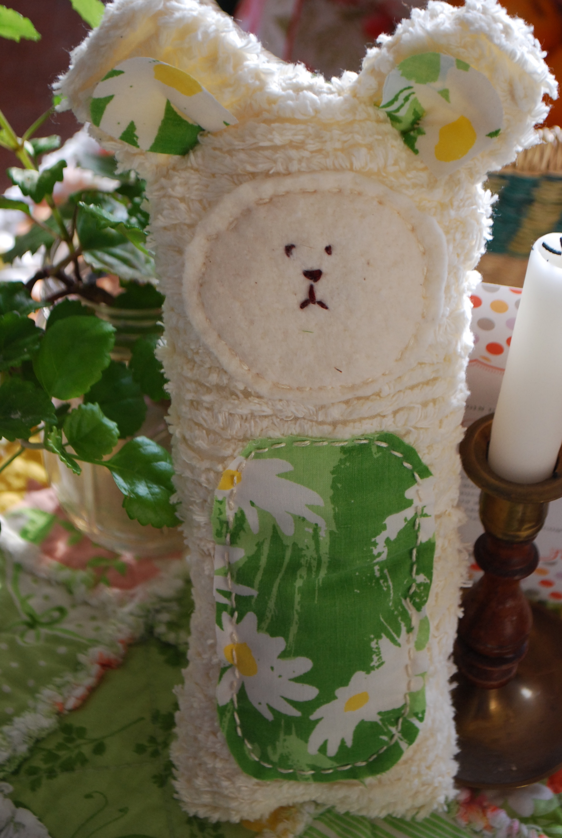 I couldn’t help myself. I had more chenille and more fabric I was dying to dip into. So I made another Easter animal. This time, an Easter Bear. I could have given this one away but I fell in love with it. So, I’m keeping it for Ellie. I fear by the time I am done, she will have a whole zoo of softie animals.