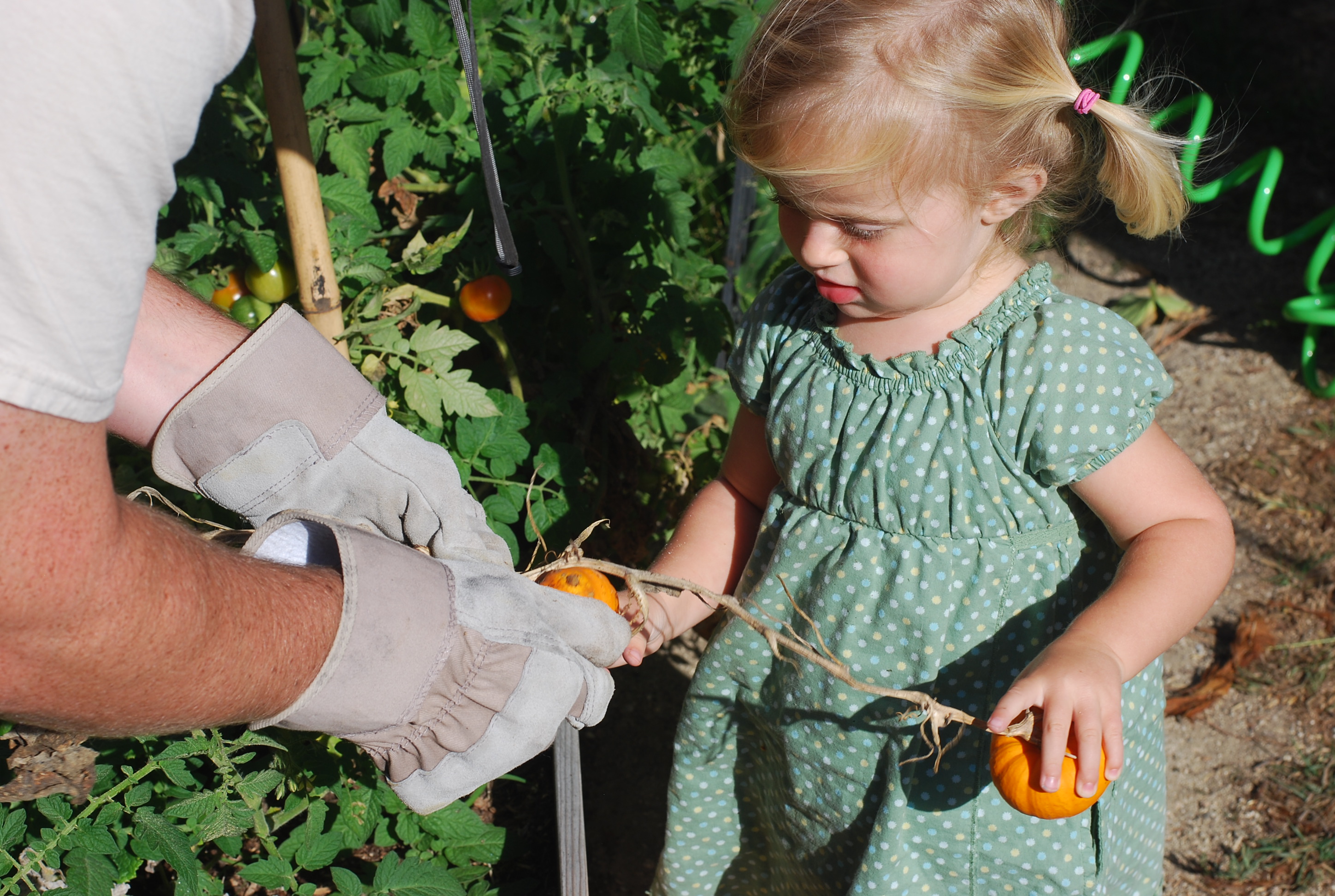 Our Labor Day weekend was made up of long car rides to barbeques with cousins, in pools I used to swim in as a child. Steak dinners with the folks. Hot, hot weather for our little beachy town (hence the half-naked child running around with popsicles). Welcoming September with a major tending to the garden. Tomato picking (and eating). Pulling homegrown pumpkins from their vines already. Granola making and lots and lots of play.